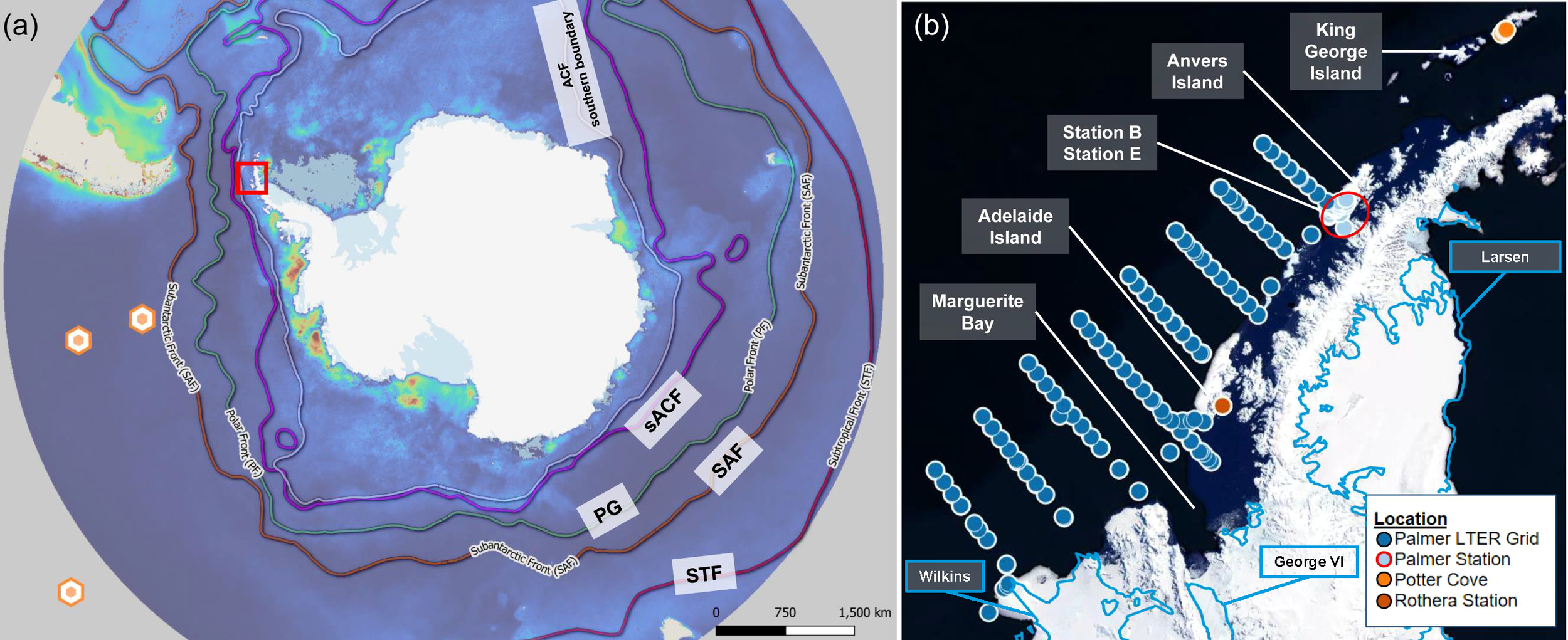 In addition to water sample collection over the WAP shelf, the Palmer LTER program also samples quasi-weekly during austral summer from two nearshore sites near the Palmer Research Station on Anvers Island (Figure 1B). Station B, located at 64.7795°S/64.0725°W, is <1 km from shore and in waters of 75 m depth. Station E, located at 64.815°S/64.0405°W, is farther offshore and more directly exposed to the continental shelf and open ocean, with a water depth of 200 m. The start of each sampling season is subject to boat access due to severe weather conditions and sea ice presence, thus ranging from mid-October to late December. During austral winter, when boat operation ceases, the Palmer LTER program also samples seawater through an inlet at 5.8 m depth, located at 64.7738°S/64.0545°W. These nearshore stations are situated near the shallow marine-terminating Marr Ice Piedmont and other land-based ice masses (Meredith et al., 2021) (Figure 1B).