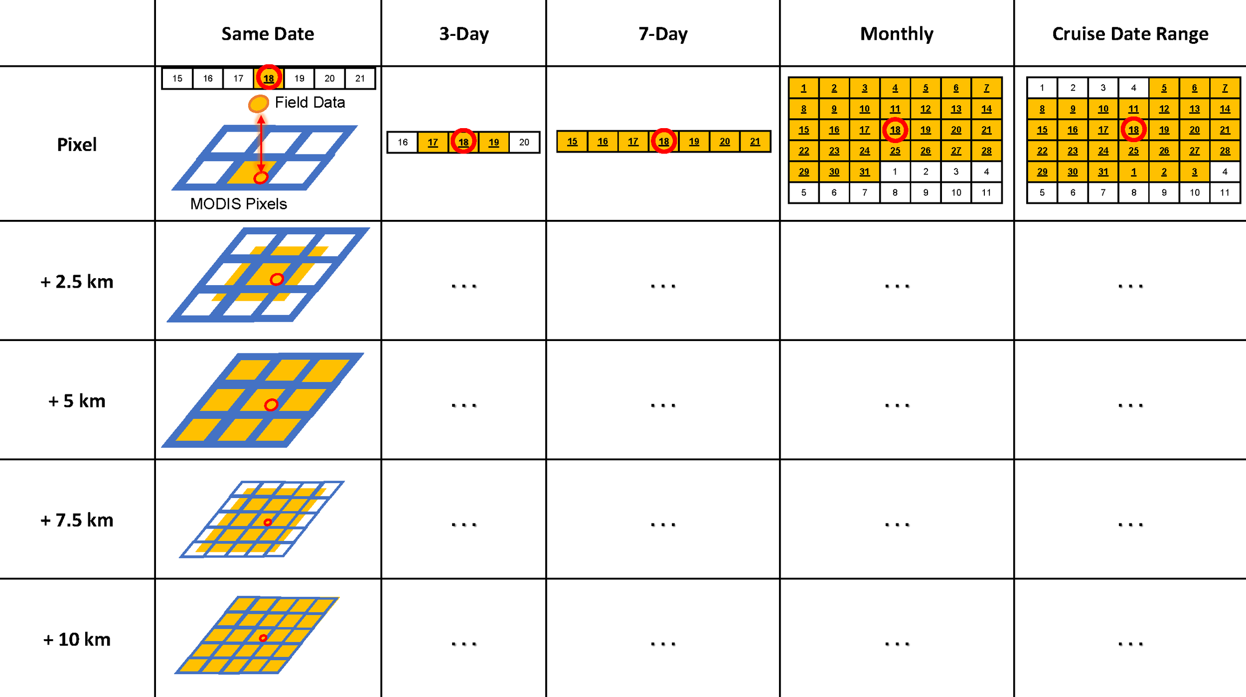 Conceptual diagram of the validation matrix in this study. In addition to comparing each field data point with its corresponding daily MODIS-based value (row 1, column 1), each field sample is also compared with spatially and temporally averaged MODIS-derived values.