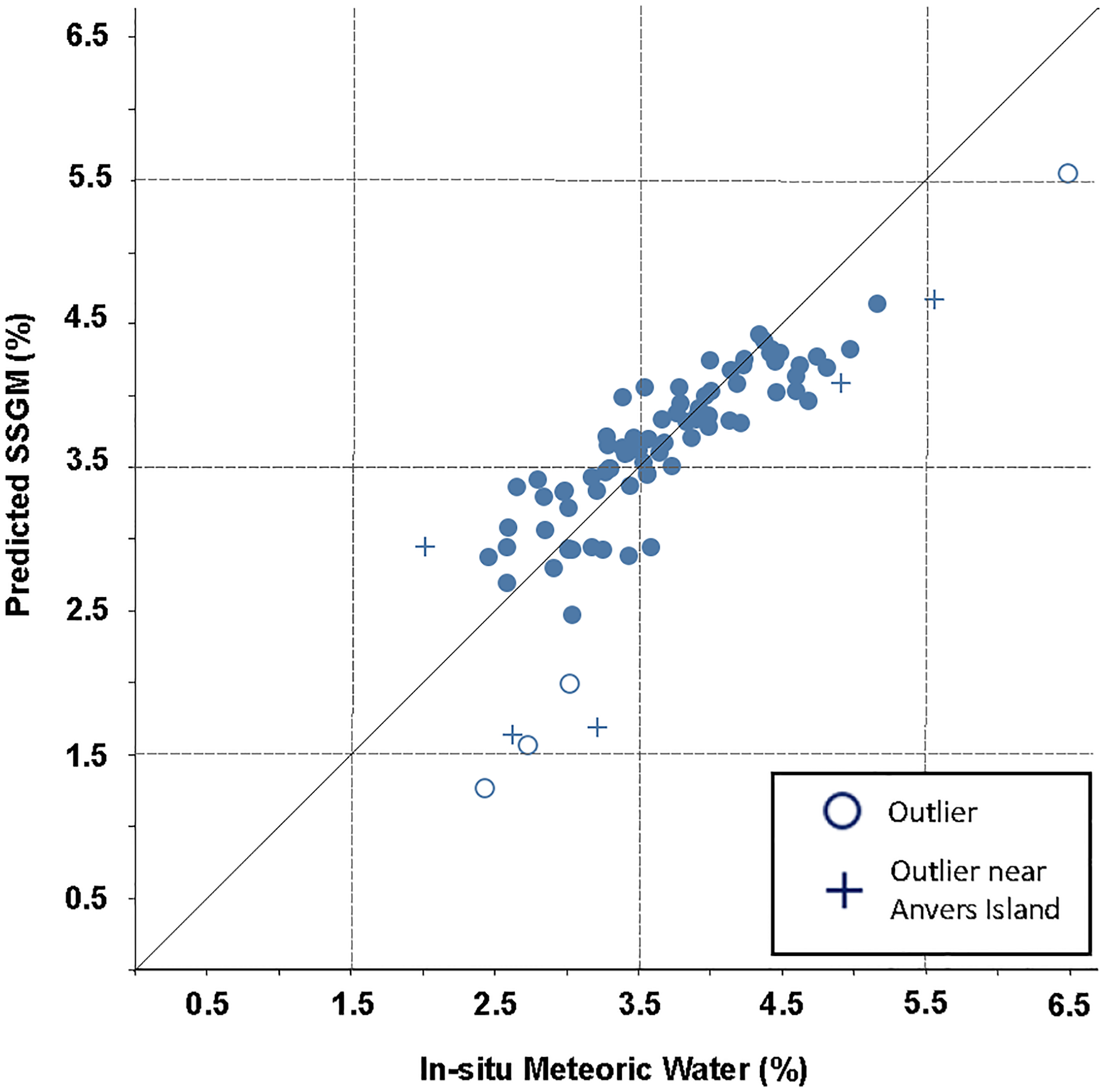 This system of equations is solved for Fsim, Fmet, and Fow, which are the respective fractions of the three components in each sample. Ssim, Smet, and Sow are the salinity values for the end-member source components, while δ18Osim, δ18Omet, δ18Oow are the corresponding δ18O values. Endmember values are taken from the previous studies that generated our combined field dataset (Table 1); these data sources include Palmer LTER grid (Meredith et al., 2017a), Palmer Station on Anvers Island (Meredith et al., 2021), Potter Cove (Meredith et al., 2018), and Rothera Point on Adelaide Island (Meredith et al., 2010) as described above.