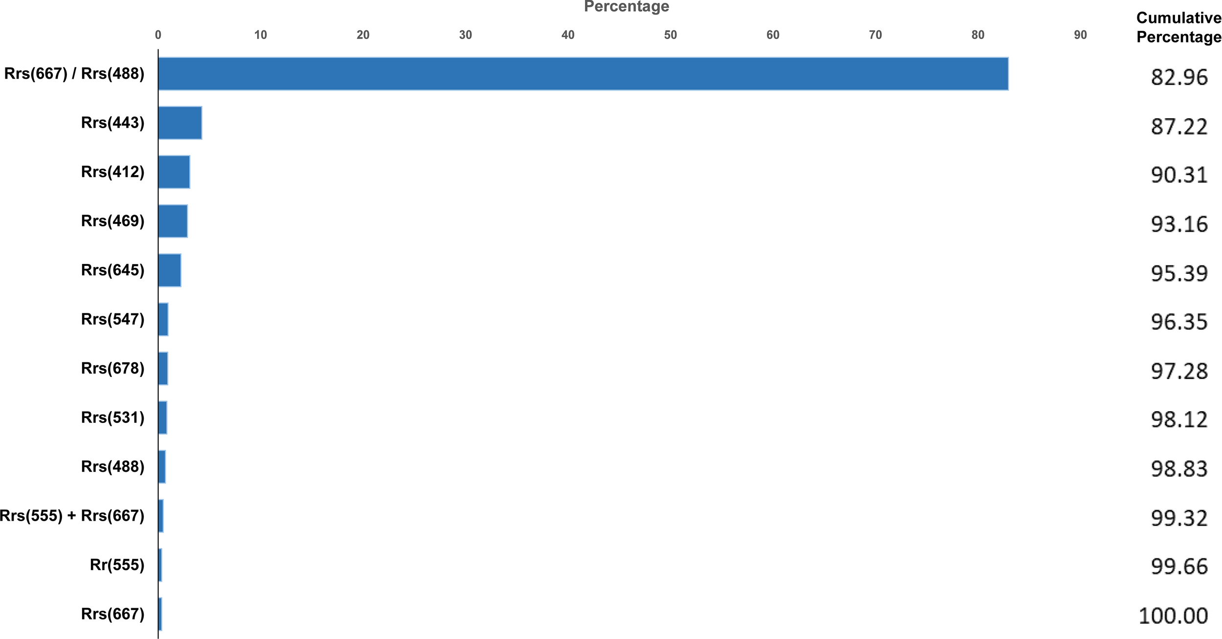 Notably, we intentionally introduce Rrs bands that were designed for terrestrial and atmospheric applications – in particular, Band 1 centered around 645 nm, Band 3 centered around 469 nm, and Band 4 centered around 555 nm. The results demonstrate the model’s ability to distinguish valid information (i.e., various Rrs bands designed for ocean observation were selected as top input variables and they can explain 90.31% of the model’s total variance). These results also highlight the model’s robustness to provide valuable insights instead of merely over-fitting to the target variable with all available input data indiscriminately.