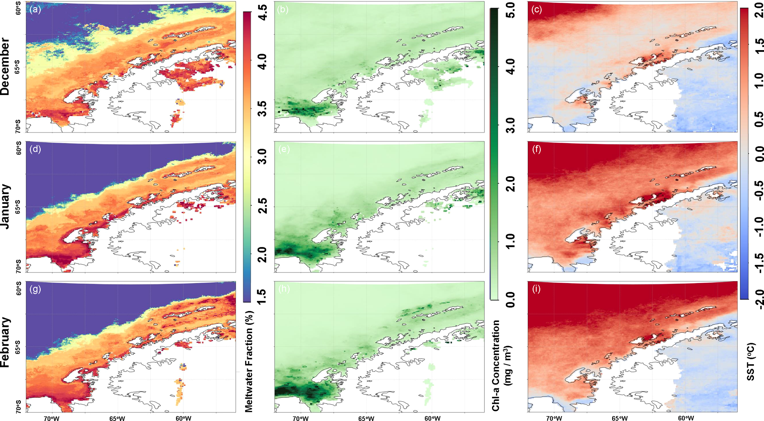 Monthly climatology of the Austral summer months from 2010 to 2020: (A, D, G) sea surface glacial meltwater, (B, E, H) chlorophyll-a concentration, and (C, F, I) sea surface temperature derived from MODIS-Aqua.