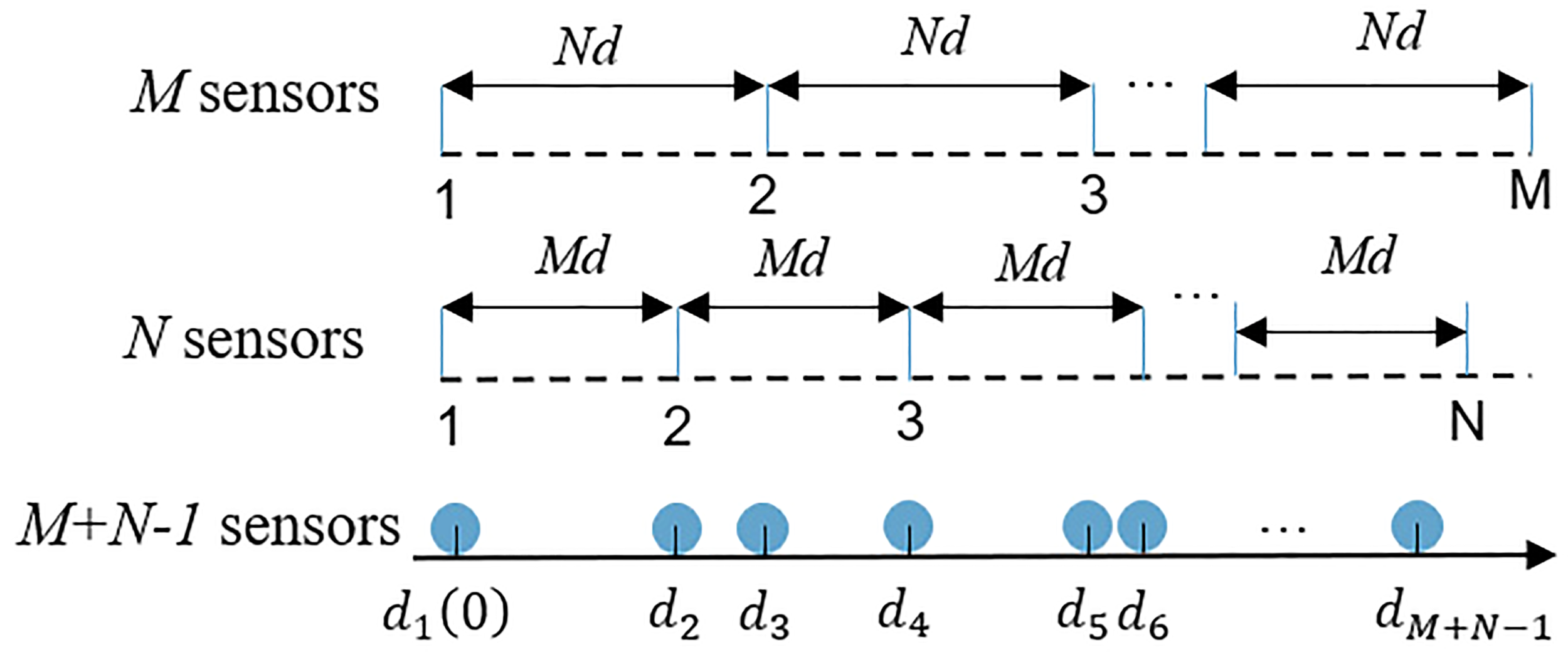An underwater acoustic vector sensor linear array consists of two sparse uniform vector sensor linear subarrays with M and N physical sensors, respectively. The values of M and N are coprime. The first subarray containing M sensors is spaced apart by Nd, whereas Md spaces apart the second subarray containing N sensors. Here, represents the intersensor unit spacing, where λ indicates the wavelength of the narrowband signal received by the array. With two subarrays sharing the first sensor, the other sensors of each subarray are arranged according to the original structure, and the array configuration is represented in Figure 1 and Equation (1).