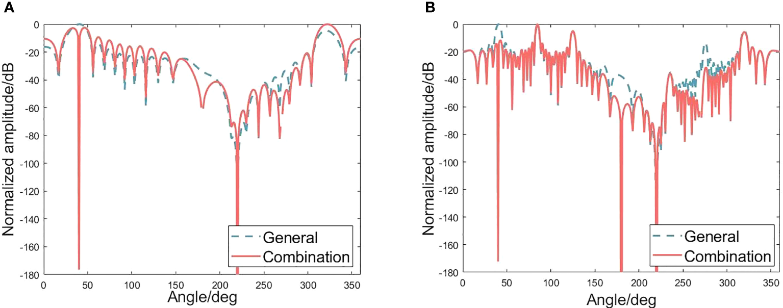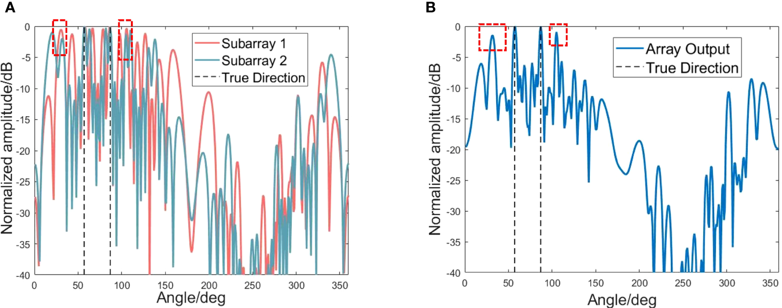 where , , and α and β are two angles satisfying the overlapping relationship of grating lobes. For instance, as shown in Figure 4, the directions of and marked by the black dotted lines are the true co-frequency sources’ directions, whereas the directions of and marked by the red dotted boxes are the false-alarm directions. In Figure 4A, the main lobe of one subarray and the grating lobe of the other subarray coincide, or the grating lobe of one subarray and the grating lobe of the other subarray coincide (as shown in red dotted boxes). Consequently, ambiguity emerges in comparable amplitude beam output to true sources, as shown in Figure 4B.