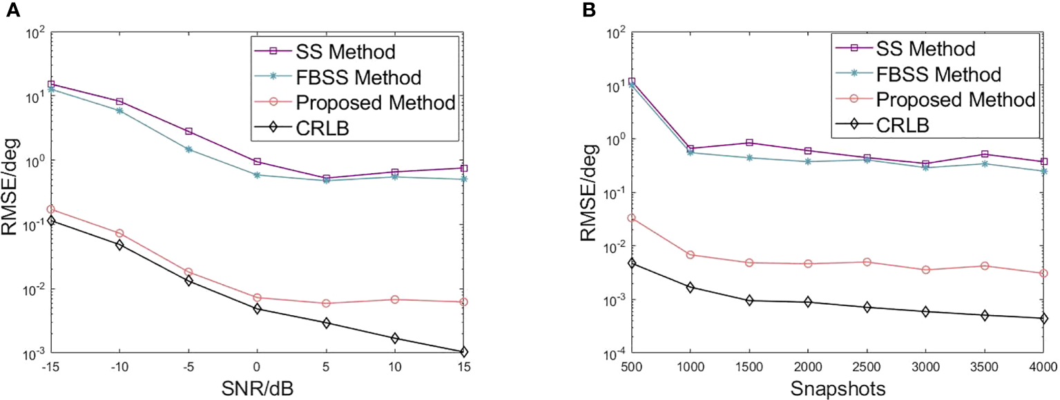 Method performance comparison. (A) Method performance comparison when the SNR = 10 dB and the signal snapshot is 1,000. (B) Method performance comparison when the SNR = −10 dB and the signal snapshot is 1,000.