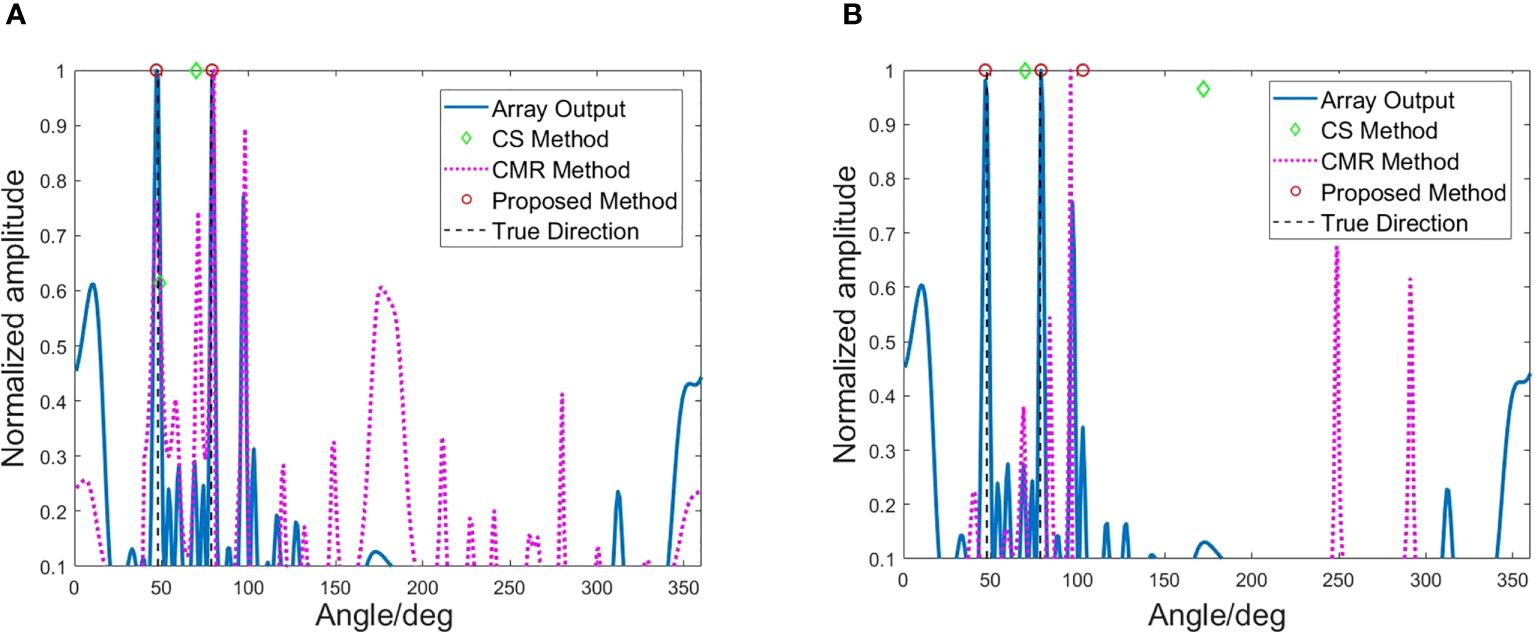 The technique of spatial smoothing processing is a widely employed method for decorrelation in practical applications, serving as a foundation for numerous studies. Next, we implement and compare the approaches based on signal covariance matrix recovery (CMR) (Pan et al., 2022) and sparse signal reconstruction using compressive sensing (CS) (Das et al., 2016) with our method. The directions of co-frequency signals are 47.9° and 78.5°, with an SNR of 10 dB and a signal snapshot of 1000. From Figure 8A, it can be observed that the proposed and the CS methods can obtain the target direction information. The CMR method also achieves high-amplitude output in target directions but suffers from ambiguity. In Figure 8B, when the SNR decreases, both the method in this paper and the CMR method show ambiguous orientation, and the CS method shows direction misjudgment.