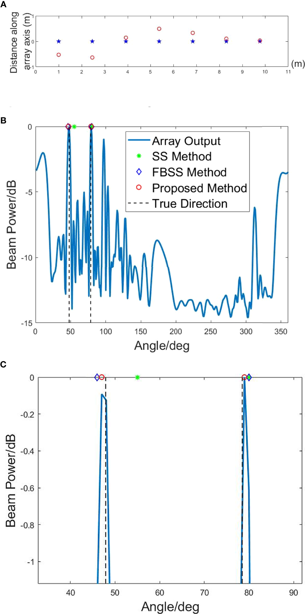 In array signal processing, the signal mismatch is a critical issue. In this part, the element position errors are considered to assess the impact of signal mismatch on the proposed method (Yang, 2017). The spacings between array elements were assumed to hold the random error with a mean of 15% of the unit spacing between two sensors, which can be shown as Figure 9A. Receiver positions are represented by symbols, with the desired locations denoted by "" and the actual locations denoted by "". In Figure 9B, one can find that in the presence of array element errors, the SS method has a DOA estimation bias. In comparison, the FBSS method performs a better DOA estimation accuracy. Compared with the two methods, the method of this work can obtain more accurate DOA estimation results. In addition, it can be seen from Figure 9C that the DOA estimation results of the method depend on the beam output obtained by the conventional beamforming (shown in the legend of "Array output" in the figure). Therefore, the DOA estimation error of the method will be affected by the array beamforming output. However, the algorithm still inherits the robustness of CBFs.