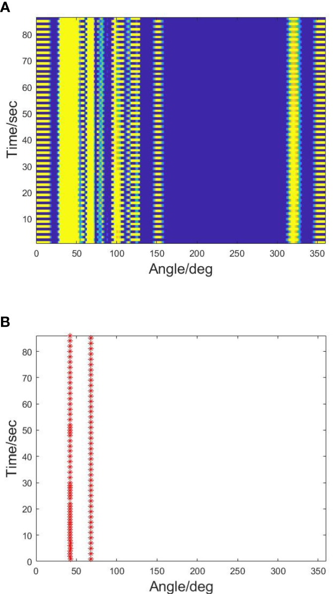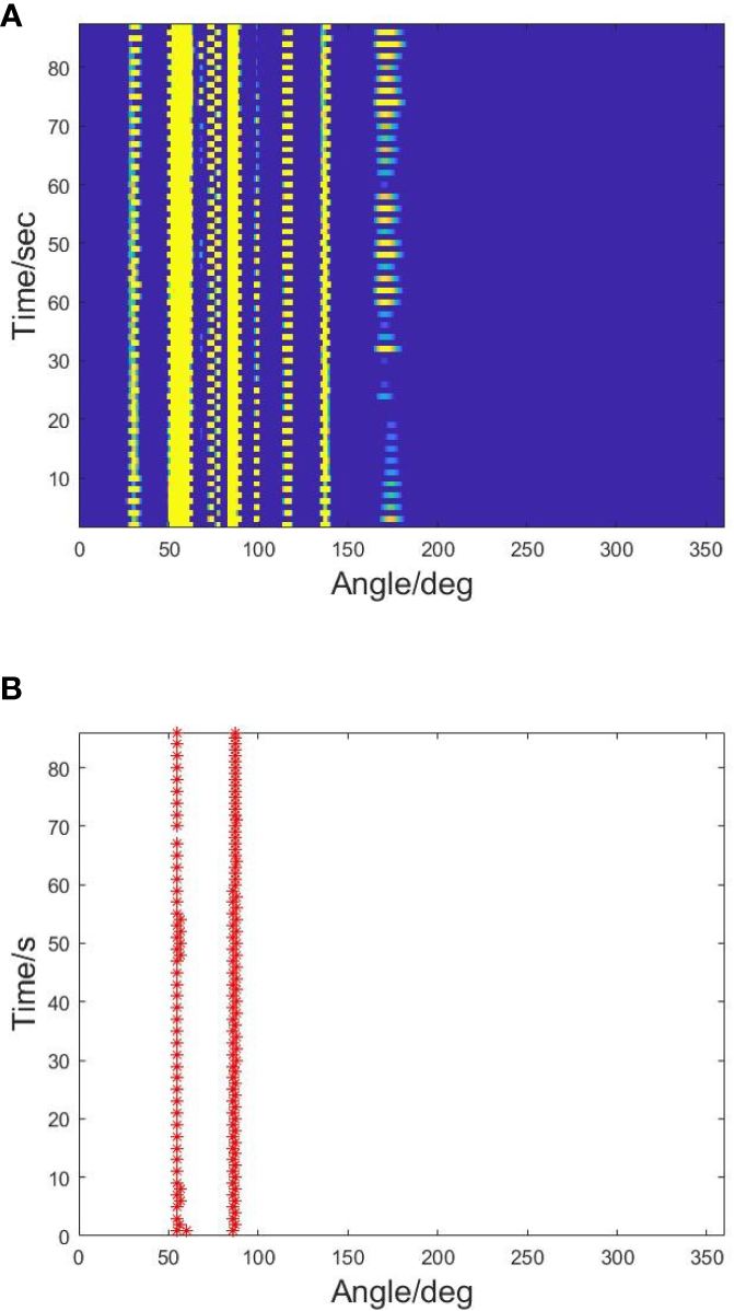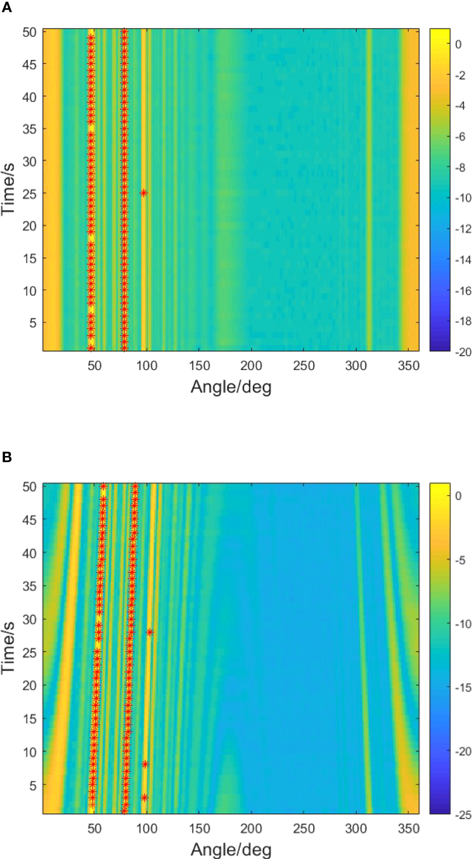 This part simulates the bearing time record (BTR) under low SNR. As shown in Figure 10, the red "*" represents the detection result of the algorithm. Figure 10A conducts the simulation for two targets with directions changing. Furthermore, the simulation design ensures high grating lobe interference in the direction change interval (SNR = 0 dB). It can be seen from the figure that many high grating lobe interferences have a severe impact on the target detection results. However, this paper’s method can detect targets’ actual orientations more stably and accurately. Figure 10B depicts the scenario where two co-frequency targets generate the high grating lobes, with the SNR of both targets being −5 dB, while the targets move in a constant azimuth. It can be seen that there is substantial interference in the direction of the end fire of the array, which will seriously deteriorate the performance of DOA detection. The red "*" shows that the proposed algorithm in this paper demonstrates a stable estimation of true DOAs.