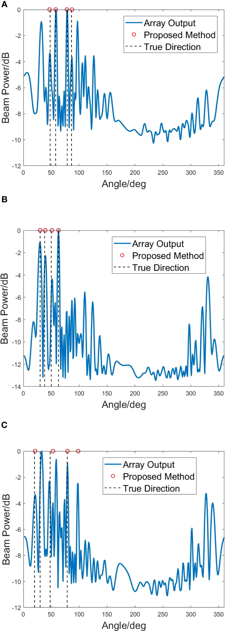 Multiple co-frequency target detection can be divided into three main cases: (1) All targets fall into the relation of overlapping grating lobes. (2) None of the targets fall into the relationship of overlapping grating lobes. (3) Some of the targets hold overlapping grating lobe relation. We set M = 5, N = 6, SNR = −7 dB, and f = 500 Hz. For the first case, there are targets from the directions of 47.9°, 57.8°, 78.5°, and 86.2° respectively, and all of them satisfy the grating lobe overlapping relation. In Figure 11A, one can find that due to the grating lobes, the real directions are submerged within the false alarms, affecting the accurate detection of targets. For the second case, the source directions are set as 30°, 38°, 50°, and 63°. These directions are not in the relationship of grating lobes overlapping. In Figure 11B, without the grating lobes overlapping, array grating lobes will not mask the true direction, and the algorithm can directly obtain the correct target directions’ information. However, when some of the targets fall into the relation of overlapping grating lobes, they are from the directions of 20°, 30°, 47.9°, and 78.5°, respectively. As shown in Figure 11C, the method proposed in this article cannot accurately determine the target’s true direction from the overlapped lobes of partial targets. Because of the complex grating lobe relationships caused by multiple targets, the feature relationships of the JCTs are affected. Future research will focus on studying and attempting array interference suppression techniques to address this issue.