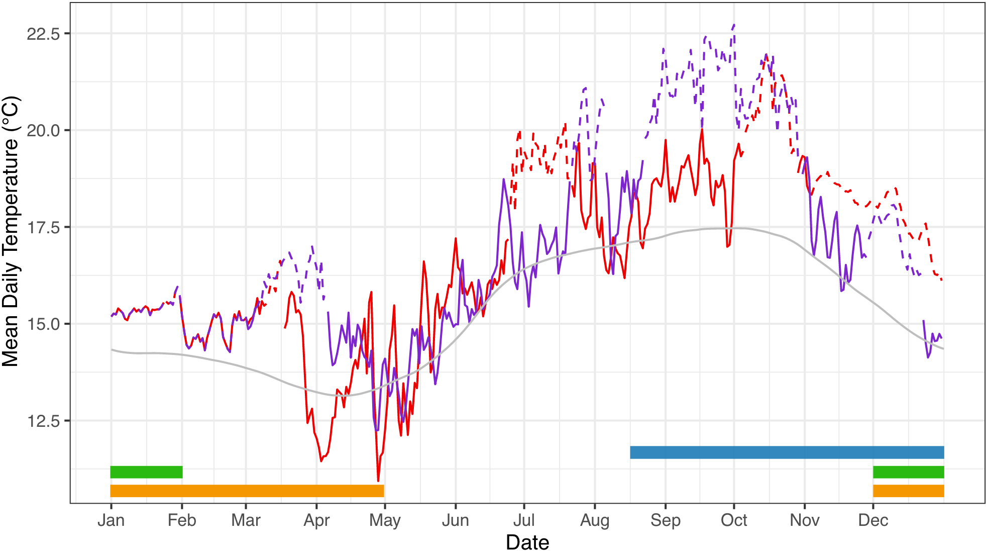 Mean daily temperature experienced by adult purple sea urchins during the 2014-2015 MHW. Temperature data were collected on the benthos using ONSET HOBO temperature loggers by the Santa Barbara Coastal LTER. The red and purple lines represent 2014 and 2015, respectively; the grey line represents the climatological mean (2001-2021). The occurrence of a MHW event, identified using metrics established by Hobday et al. (2016), is indicated by a dashed line for both 2014 (red) and 2015 (purple). Timing of life history events for S. purpuratus are represented by colored bars: gametogenesis (blue), spawning (green), and planktonic larval duration (yellow) (Rogers-Bennett, 2013; Okamoto et al., 2020).