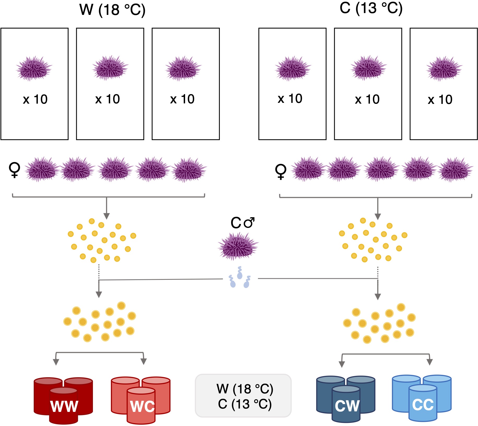 Experimental design. Adult S. purpuratus (N=60) were acclimated in either a MHW (W: 18°C) or a non-MHW (C: 13°C) condition, for a four-month period, during gametogenesis. Eggs from each maternal treatment were pooled (N=5 females per treatment) and fertilized using sperm from a single non-MHW- acclimated male. Embryos from each cross were reared at either a MHW or non-MHW temperature, resulting in four groups: WW, WC, CW, and CC. Each group was raised in three replicate culture vessels.