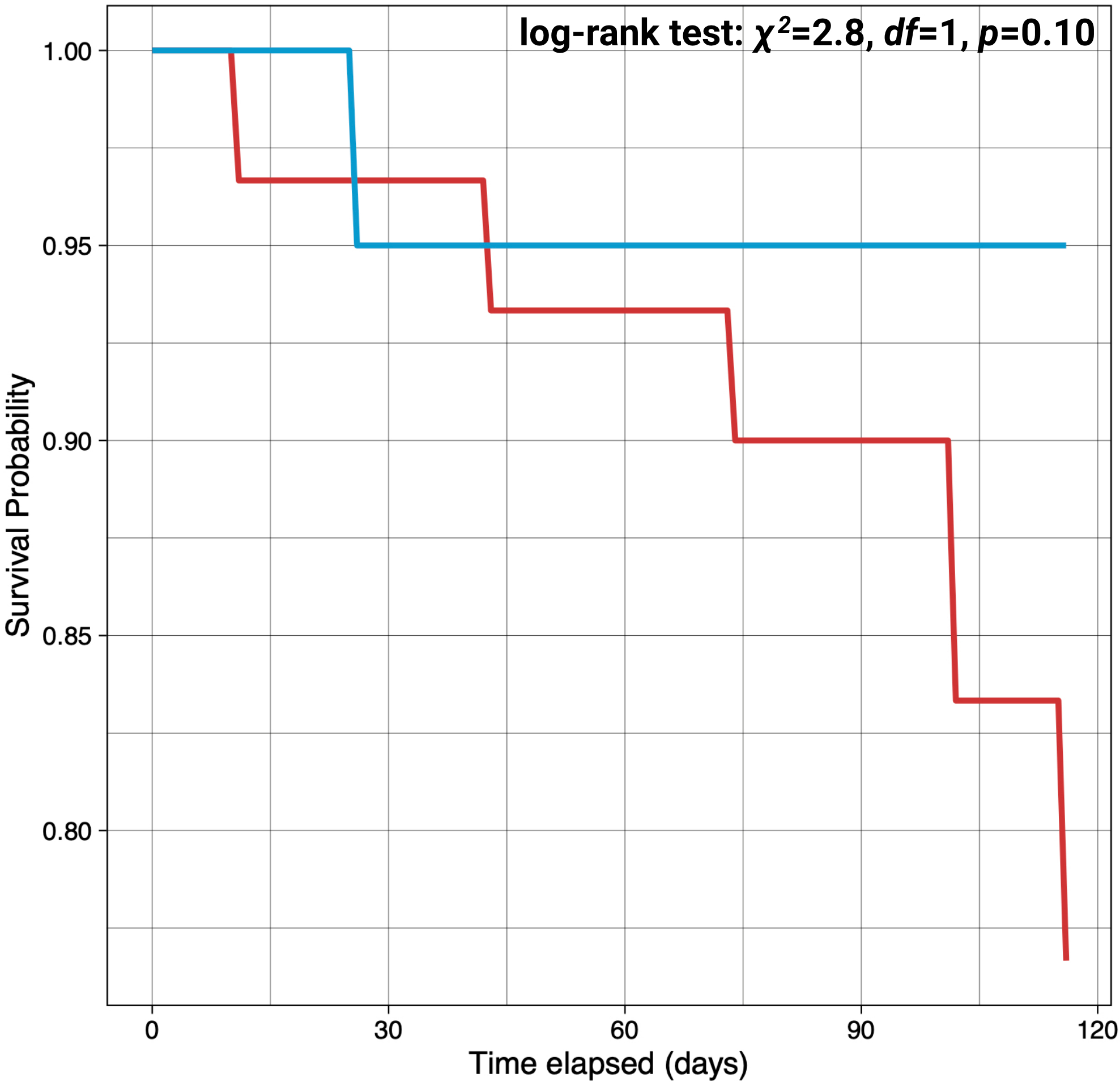 Survivorship in S. purpuratus adults over 4 months of acclimation at marine heatwave (18°C) and non-marine heatwave (13°C) temperatures. Adult urchins were acclimated to either a MHW temperature of 18°C or non-MHW temperature of 13°C for a four-month period from October to January. The red and blue lines represent survival probability for MHW or non-MHW condition, respectively.