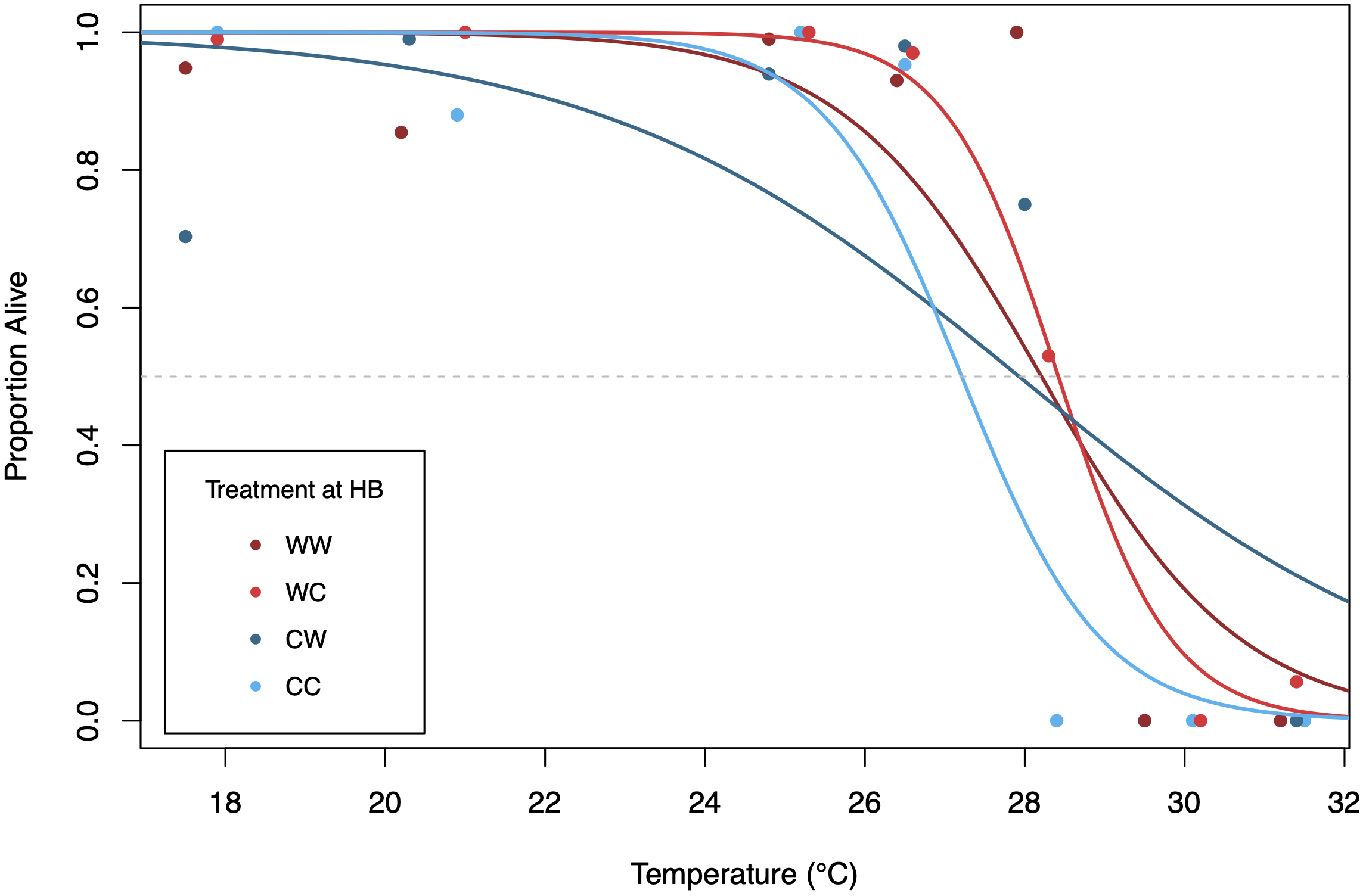 Survivorship of early-stage S. purpuratus from the four treatments. Hatched blastula from each of the four treatments were exposed to a 1-h acute temperature trial and then allowed to recover at 14°C. Following recovery and development to prism the proportion of live prism larvae were scored. Colored lines represent a logistic regression for each treatment. LT50 is shown at the intersection of the dashed grey line with the color-coded line for each group with different parentage and different developmental temperature.