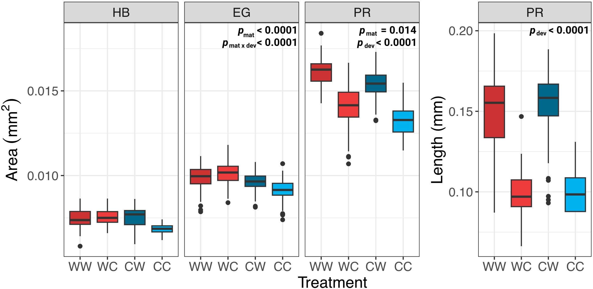 Morphometric analysis of embryo and prism stage S. purpuratus. Body size of embryos and larvae at three developmental stages: hatched blastula (HB), early gastrula (EG), and prism (PR), for each family combination (WW, WC, CW, & CC). Only results with significant p-values are displayed on each graph.