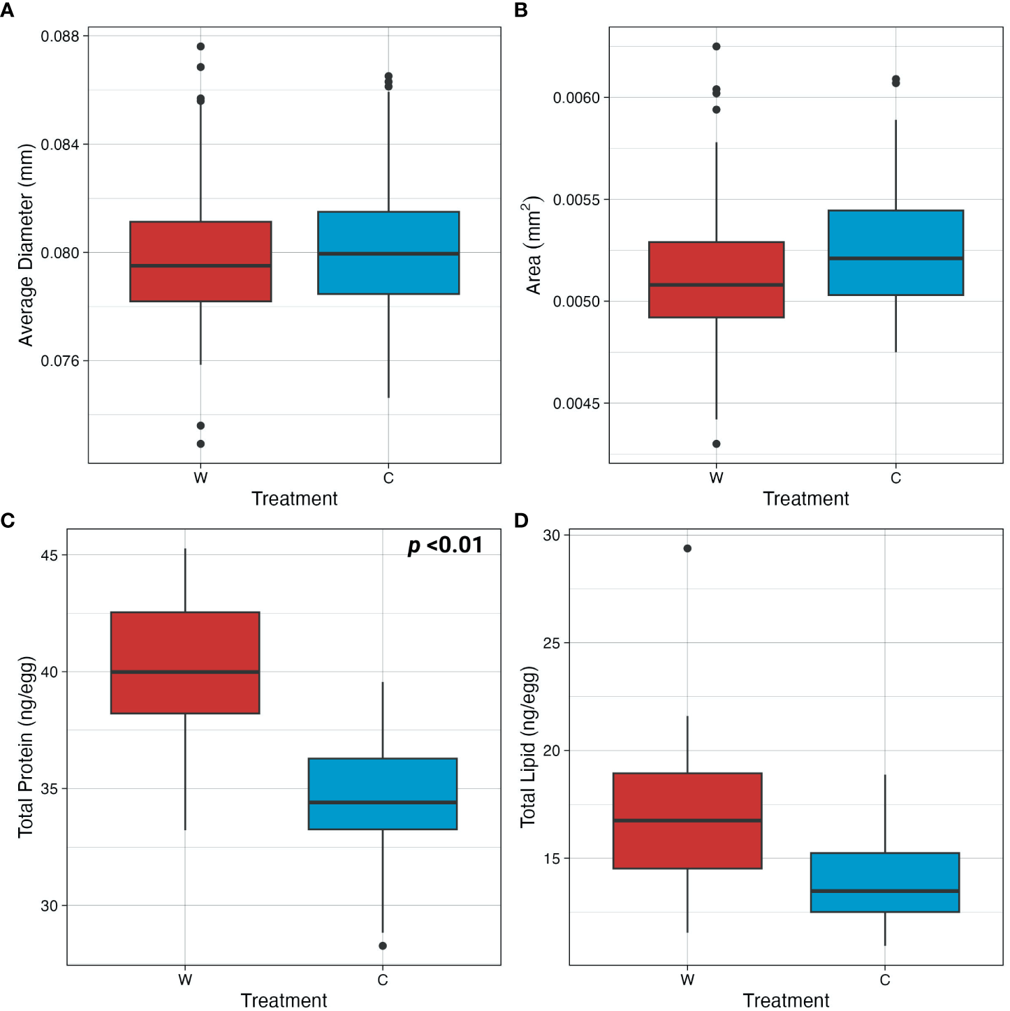Egg morphometrics and assessment of biochemical storage biomolecules. (A) Diameter and (B) 2D area of eggs from females acclimated to MHW (W) and non-MHW (C) conditions. (C) Total protein (ng/egg) and (D) total lipid content (ng/egg) of eggs from females acclimated to MHW (W) and non-MHW (C) conditions. Only results with significant p-values are displayed on each graph.