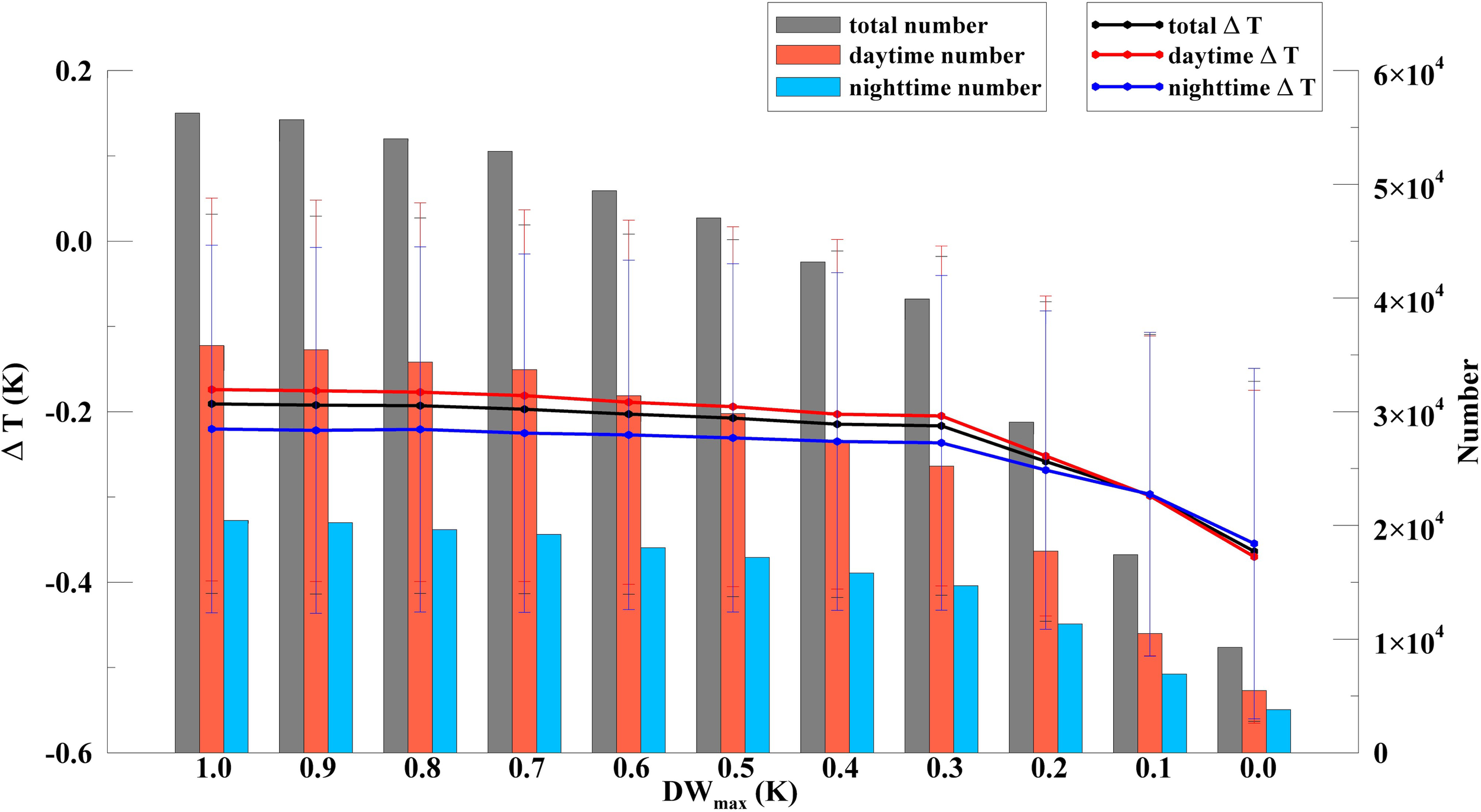 The lines show the mean ΔT under each DWmax constraint for the total (black), daytime (red) and nighttime (blue) values. The error bars represent the standard deviation. The gray, orange and blue bars display the numbers for each DWmax threshold.