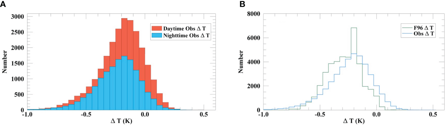 (A) The histograms of the nighttime (blue) and daytime (orange) ΔT measurements; (B) the distributions of the ΔT measurements from the F96 model (green) and the field observations (blue). The interval of the bars is 0.05 K.