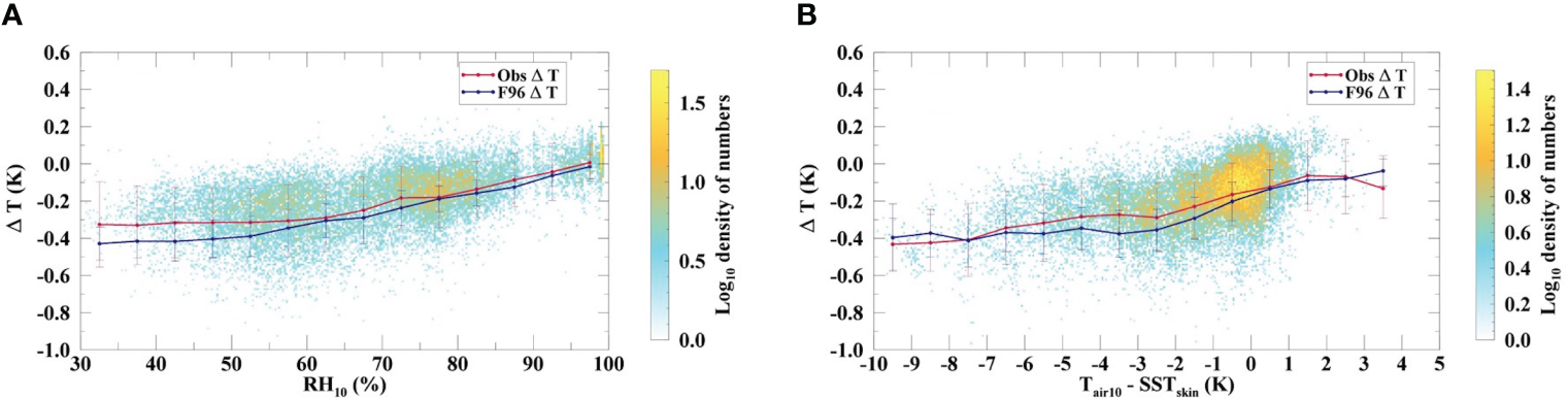 (A) The observed ΔT measurements as a function of RH10; (B) the observed ΔT measurements as a function of the temperature difference between Tair_10 and SSTskin.