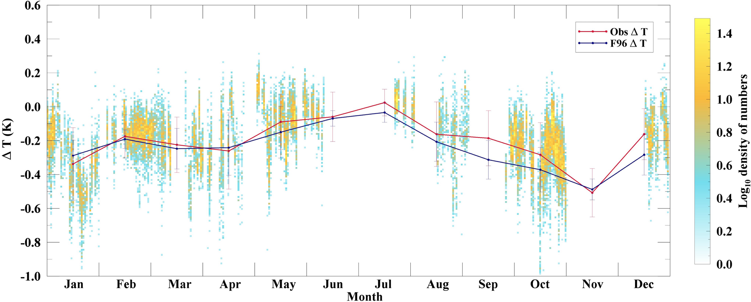 Observed ΔT as a function of local time in hours. The lines represent the mean values of the ΔT measurements from the field observations (red) and the F96 model (dark blue), with intervals of 1 hour. The error bars represent the standard deviation. The color bar indicates the densities of the observed ΔT measurements in one bin (0.07 hours and 0.01 K).