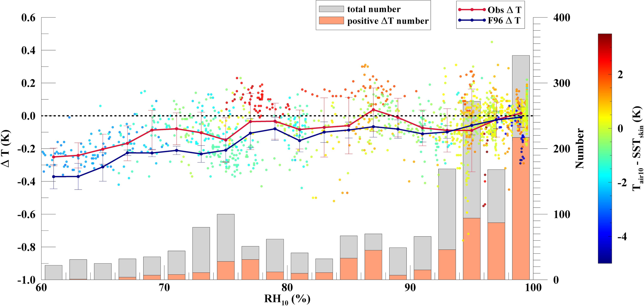 A scatter plot of the relationship between RH10 and observed ΔT values. The color bar indicates the temperature differences between Tair_10 and SSTskin. The bars represent the numbers of total (gray) and positive (orange) ΔT values within a 2% RH10 bin. The dashed line represents the ΔT value of 0 K.