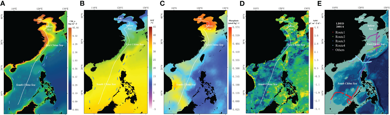 Sampling area of chlorophyll a concentration (A) versus sea surface temperature (B), nutrient salinity (C), net primary productivity of the ocean (D), and pCO2 data (E). The solid white line in the figure represents the sampling path. Among the nutrients, phosphate is used as a representative for the argument (C), and all three nutrients were actually collected.