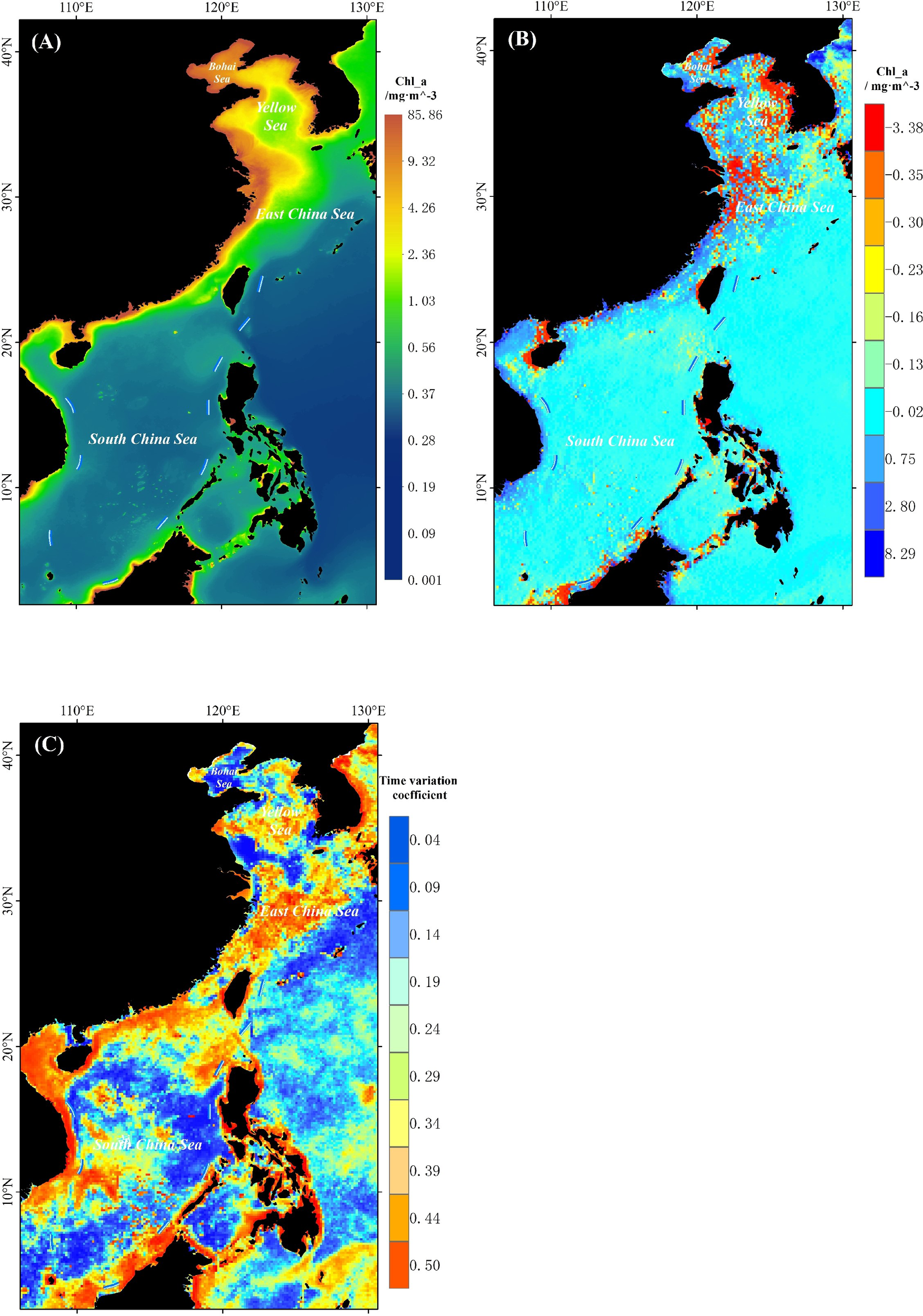 Multi-year average chlorophyll a concentration distribution (A), Cumulative change of multi-year chlorophyll a concentration (B) and time variation coefficient of multi-year chlorophyll a concentration (C) in China seas from 2002 to 2022. Both cumulative concentration changes and temporal coefficients of variation were calculated using equations (1) and (2) for the year-by-year average chlorophyll a concentration values from 2002 to 2022 on the basis of the spatial distribution of the synthesized annual chlorophyll a concentration.