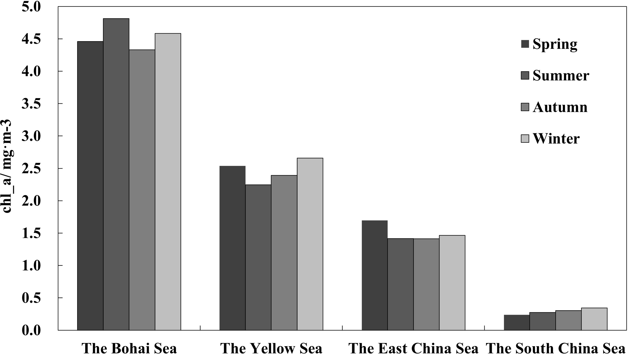 Average chlorophyll a concentration(mg/m3) in four major China seas at different periods.