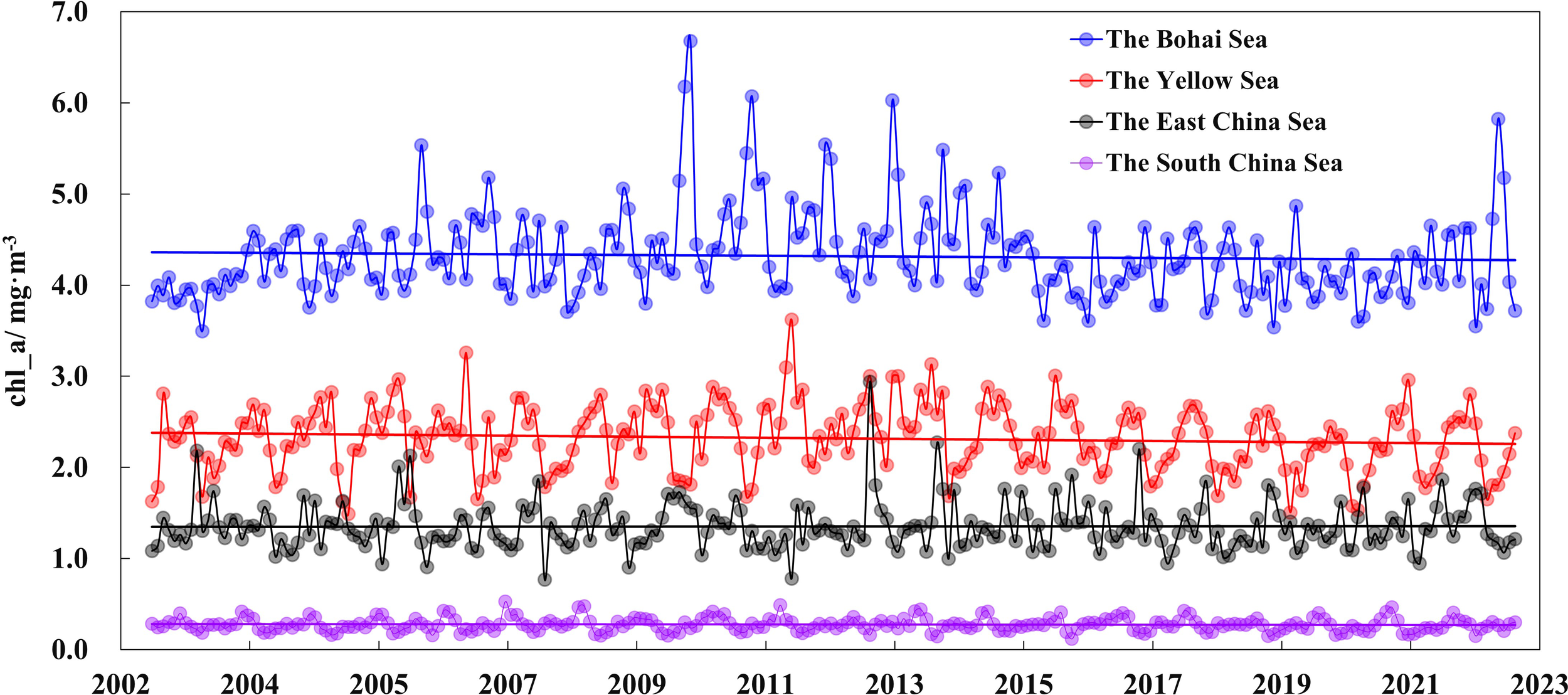Monthly average chlorophyll a concentration in four major China Seas for a long time series from 2002 to 2022.