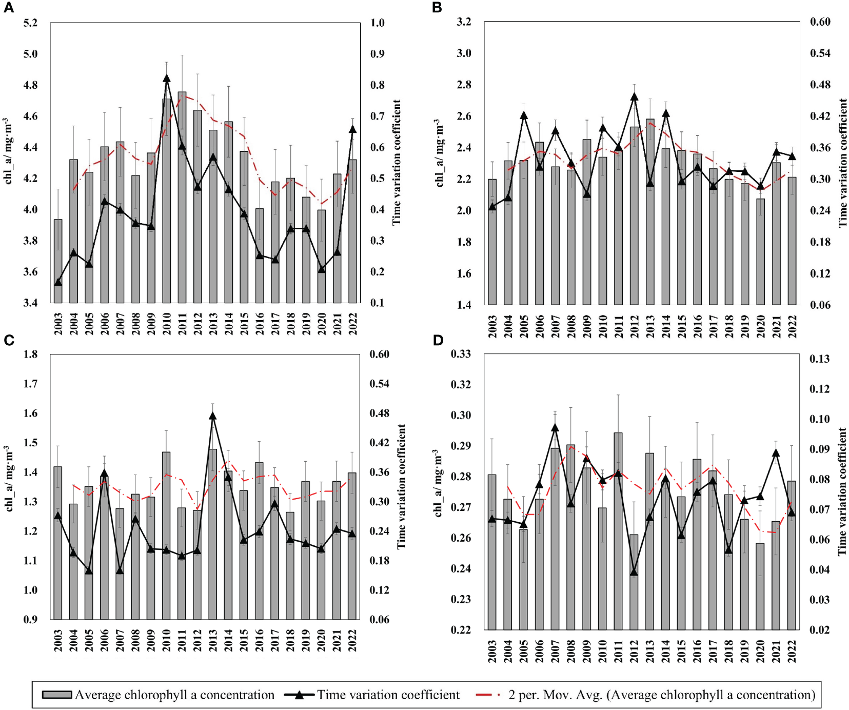Research in China has focused on the establishment and validation of chlorophyll concentration inversion models (Yue et al., 1999), the inversion of chlorophyll concentration models for different China Seas using the Gaofen 4 satellite (Yang et al., 2017), and the validation of simultaneous field sampling data for chlorophyll a concentration (Zheng et al., 2017). Some progress has also been made in the study of the spatial and temporal variation of chlorophyll in China Seas. Lian et al. (2020) studied the characteristics and causes of seasonal variation of surface chlorophyll a in the South China Sea and analyzed the effects of surface ocean temperature and dynamic processes on marine chlorophyll. Cong et al. (2006) studied the changes of chlorophyll a concentration in the Chinese continental shelf seas from 1998 to 2003 based on satellite inversion, and Hao (2010) studied the spatial and temporal distribution characteristics and environmental regulation mechanisms of chlorophyll a and primary productivity in Chinese coastal seas. In China, there are few analyses of the spatial and temporal variability of marine chlorophyll a concentration over long time series. And there is a lack of comparative variation analysis of the overall China Seas area and each constituent sea area. Moreover, the spatial and temporal variability of chlorophyll a concentration has not been explored regularly.