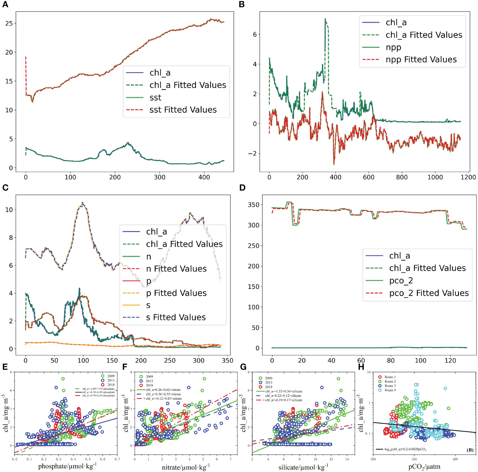 3. Analysis of the effects of multiple factors such as ocean surface temperature, seawater nutrients (phosphate, nitrate, silicate), partial pressure of CO2, and physical movement of seawater on chlorophyll a concentration in China Seas, as well as a summative analysis considering the above factors.