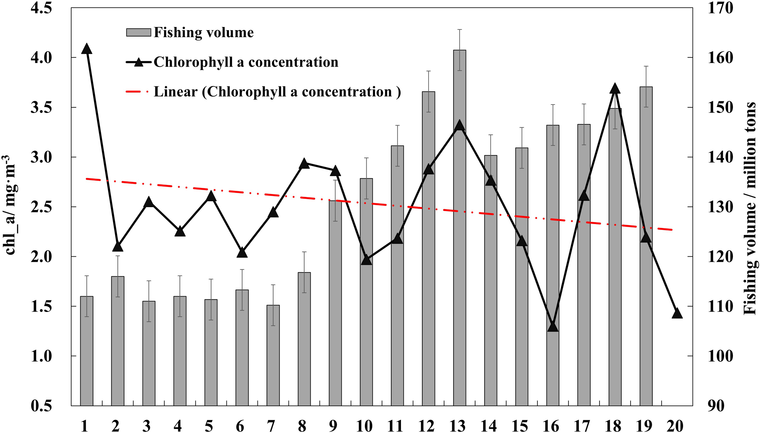 In this paper, we constructed a long time series of chlorophyll a concentration data in China Seas using the marine chlorophyll a concentration products of satellite remote sensing (MODIS/Aqua) inversions from 2002-2022. The temporal and spatial variation characteristics of chlorophyll a concentration were analyzed on the basis of long time-series of chlorophyll a concentration data, and the temporal coefficient of variation and spatial coefficient of variation were used to characterize the temporal fluctuations and spatial heterogeneity. Secondly, the accumulation difference was used to represent the cumulative multi-year variation of chlorophyll a concentration in China Seas. In addition, the correlation between chlorophyll a concentration and ocean surface temperature, ocean net primary productivity and seawater carbon dioxide partial pressure were analyzed to explore the influencing factors of chlorophyll a concentration in Chinese marine waters. Finally, the influence of the change of ocean chlorophyll a concentration on marine fishing grounds was analyzed using Zhoushan fishing grounds as an example. It is expected to provide some data support and research reference for China’s marine research and provide an important scientific basis for marine pollution management, marine ecological protection and rational marine use and development in China.