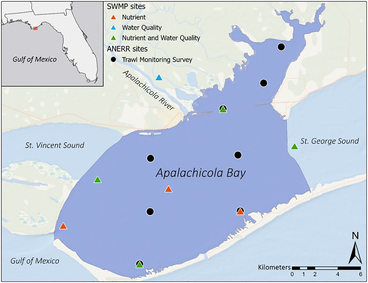 Location of ANERR’s trawl monitoring survey sites (circles) and SWMP nutrient and water quality monitoring sites (triangles) within Apalachicola Bay used for this study. The purple shaded area encompasses approximately 249 km2 of Apalachicola Bay. This area indicates the spatial domain of the food web model, which was limited to the region where ANERR’s species monitoring data were available.