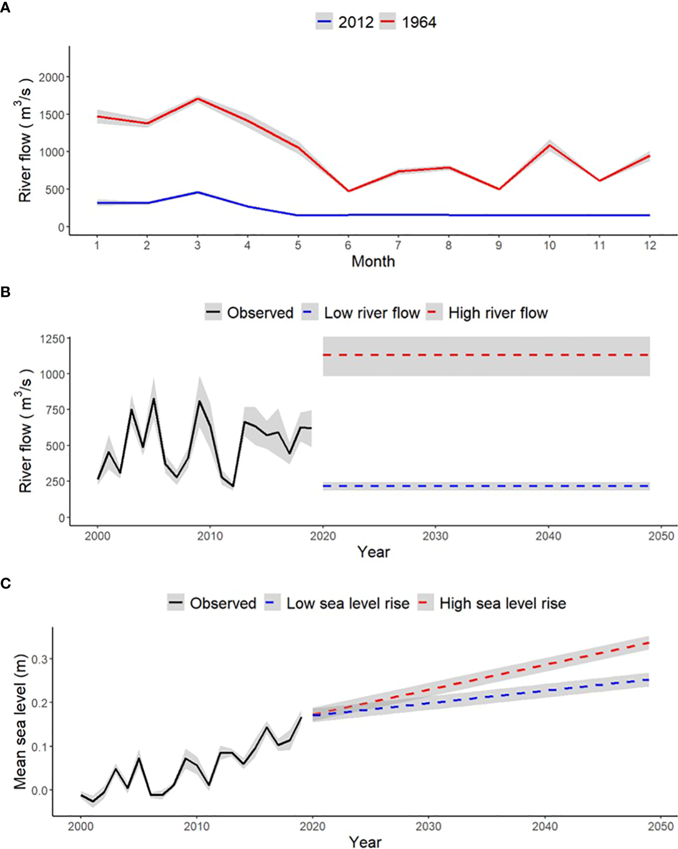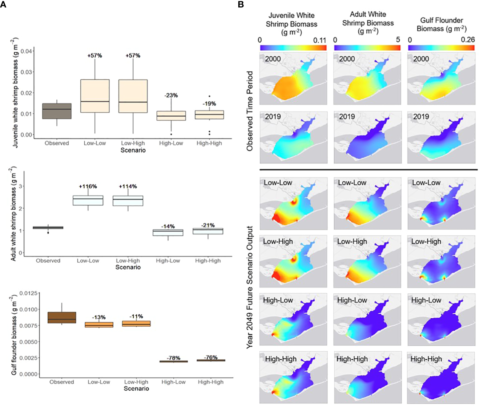 After the Delft3D model calibration and validation were complete, four future scenarios of varying Apalachicola River flow and sea level rise conditions were simulated for a 30-year period (2020 through 2049; Table 2). Each scenario used a combination of either low or high river flow and low and high sea level rise. Low and high river flow conditions were based on historically observed measures of Apalachicola River flow taken by the U.S Geological Survey river gage at Chattahoochee, FL. Historically low river flow was observed in the year 2012 (annual average flow of 215.33 m3/s) and historically high river flow was observed in the year 1964 (annual average flow of 1132.71 m3/s). Monthly flow patterns from these years were repeated for each year of the 30-year low or high river flow simulations (Figure 2). Sea level rise conditions were based on observed rates of sea level rise in the Apalachicola Bay region over the course of 54 years (1967 to 2021) taken from the NOAA tide gage in Apalachicola, FL. The current observed rate of sea level rise (2.82 mm/year) was chosen to represent “low” sea level rise conditions for the future simulations and a doubled rate of sea level rise (5.64 mm/year) was chosen to represent “high” sea level rise. Each of these rates of sea level change were applied across the 30-year low or high sea level rise simulations (Figure 2). The four scenarios (Low River Flow–Low Sea Level Rise, Low River Flow–High Sea Level Rise, High River Flow–Low Sea Level Rise, High River Flow–High Sea Level Rise) were simulated through the hydrodynamic model, which provided resulting outputs of monthly Apalachicola Bay salinity and water temperature in the form of ASCII grid files over the 30-year simulation period. These grid files were cropped to fit the spatial domain of the food web model (Figure 1) and served as inputs to Ecospace to drive changes in species biomass over time and space.