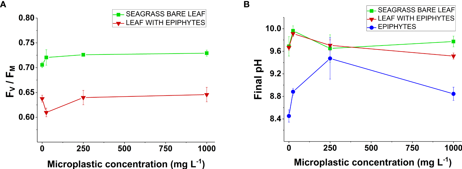 (A) Variable chlorophyll fluorescence of Z. marina. ratios as a function of increasing microplastic concentration (0, 25, 250, and 1000 mg MP L-1). Measurements were conducted on seagrass leaves with (red line) and without epiphytes (green line). Symbols with error-bars represent mean values ± SEM. Four biological replicates (n = 4). (B) Final pH values of Z. marina as a function of increasing microplastic concentration (0, 25, 250, and 1000 mg MP L-1). Measurements were conducted on seagrass leaves with (red line) and without epiphytes (green line), as well as on separated epiphytes (blue line). Symbols with error-bars represent mean values ± SEM. Four biological replicates (n = 4).