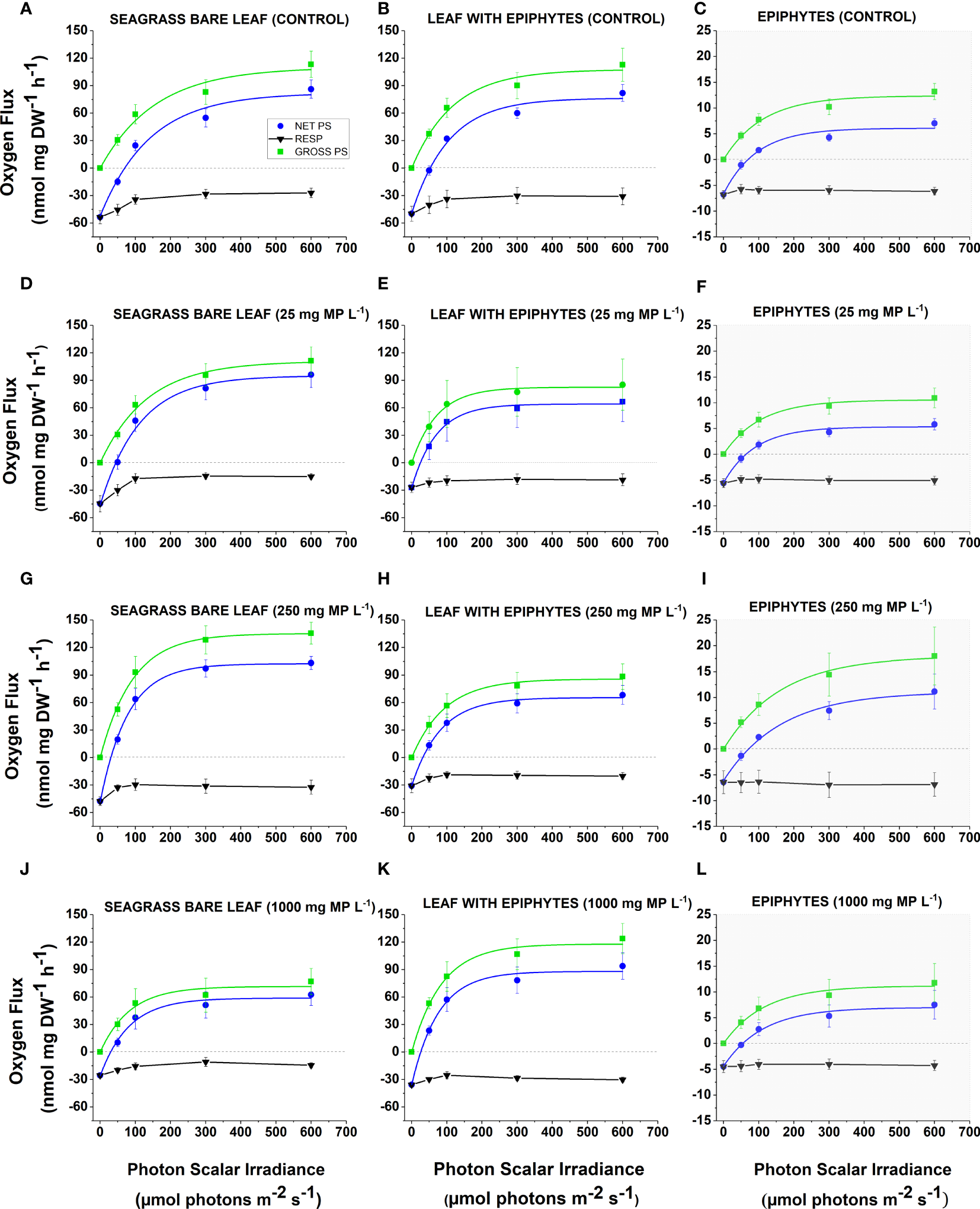 The gross photosynthesis (Figure 3A–L) increased with increasing photon scalar irradiance until saturation and was the highest for bare seagrass leaves exposed to 250 mg MP L-1 (Figure 3G), and lowest for separated epiphytes cultured at 25 mg MP L-1 (Figure 3F). There was a decrease in the respiration rates with increasing photon scalar irradiance for most specimens, except in separated epiphytes that remained relatively stable throughout all treatments. The net photosynthesis rate (Figures 3A–L) of all specimens also increased with increasing photon scalar irradiance, until saturation. The highest net photosynthesis rate was found in bare leaves exposed to 250 mg MP L-1 (Figure 3G) and the lowest was found in separated epiphytes exposed to 25 mg MP L-1 (Figure 3F). In general, all separated epiphyte samples exhibited low photosynthetic activity, which could indicate a high proportion of heterotrophic bacteria and dead or inactive algal biomass in the leaf epiphytic biofilm.