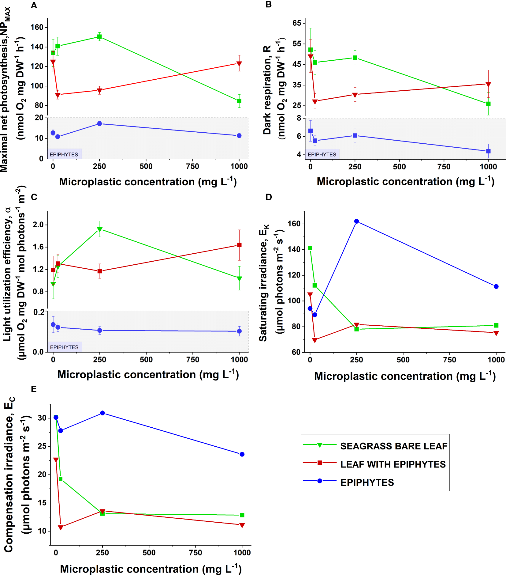 (A) Maximum photosynthetic rate (), (B) dark respiration (R), (C) light utilization efficiency (), (D) photon irradiance at the onset of photosynthesis saturation () and (E) compensation photon irradiance () as a function of increasing microplastic concentrations (0, 25, 250, and 1000 ). Green symbols and lines show bare seagrass leaves. Red symbols and lines show leaves with epiphytes. Blue symbols and lines show separated epiphytes. In subfigures (A-C), areas in gray show a different scale on the y-axis, as values for separate epiphytes were markedly lower. Symbols with error bars represent mean values ± SEM. Four biological replicates (n = 4).