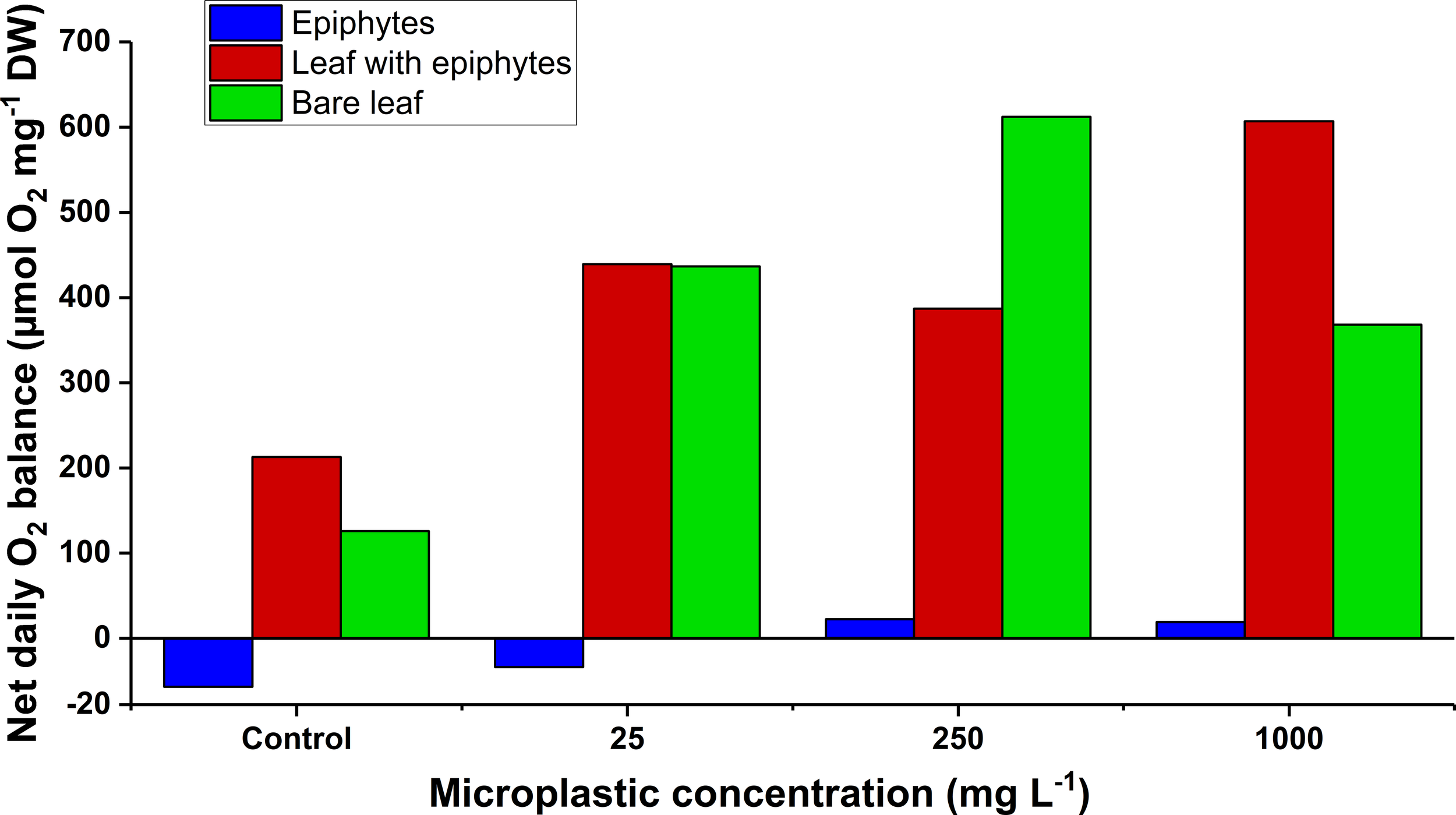 The net daily oxygen production as a function of increasing microplastic concentrations (control, 25, 250, and 1000 mg MP L-1) of the leaf and epiphyte communities. Blue bars represent epiphytes originating from Z. marina leaves. Red bars represent Z. marina leaves with epiphyte cover. Green bars represent bare Z. marina leaves. The net daily oxygen production was estimated from previously fitted exponential saturation models (n = 4) at increasing microplastic concentrations (Figure 3, all with ≥ 0.90 and p ≤ 0.05) using a14 h:10 h light/dark cycle measured in situ (Staehr et al., 2018). The black line at y = 0 demonstrates a neutral carbon balance. Slightly different scaling on the y-axis below y = 0, is due to markedly lower values for separate epiphytes.