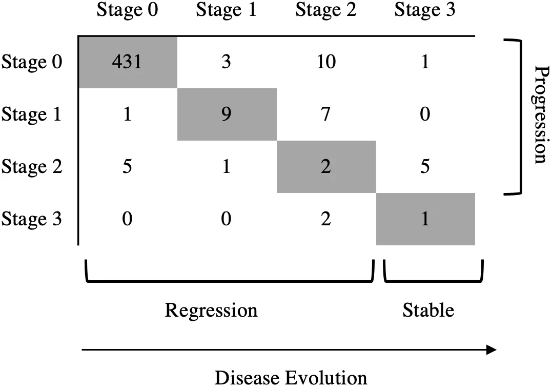 Shaded cells indicate total individuals for which no change was observed in number of tumours between re-sightings. Transitions represent initial stage at first sighting, and stage at latest re-sighting. Cases of regressions are summarized on the top half of the diagram, and regression cases at the bottom.