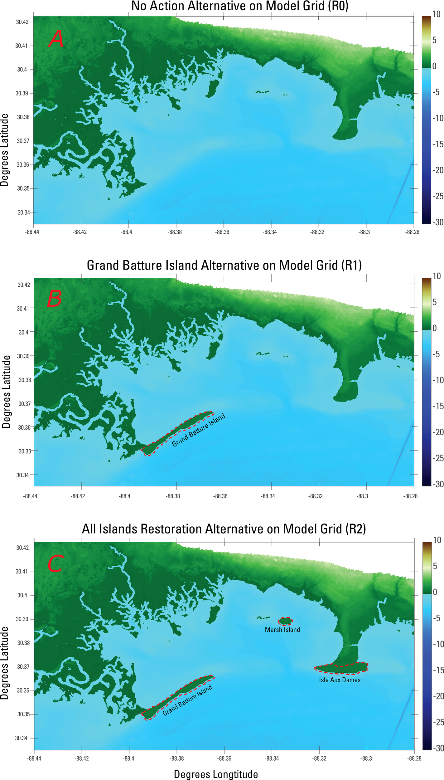 Elevation of restoration alternatives on Model Grid: R0 represents the no-action scenario (A), R1 represents the Grand Batture Island only scenario (B), and R2 represents the Grand Batture Island, Marsh Island, and Isle aux Dames scenario (C). Red dashed lines indicate the total sub-aerial and sub-aqueous footprint of each restored feature. Color bar in meters.