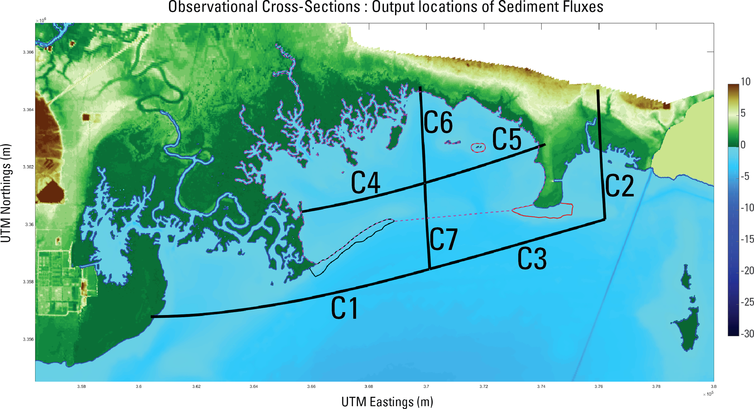 Observational output cross-sections in model domain, plotted over model DEM. Contours show the shorelines of each restoration scenario. R0 in blue, R1 in black, and R2 in red. The magenta dashed line shows the area considered as within Grand Bay and the estuary, for mean values presented in Table 3.