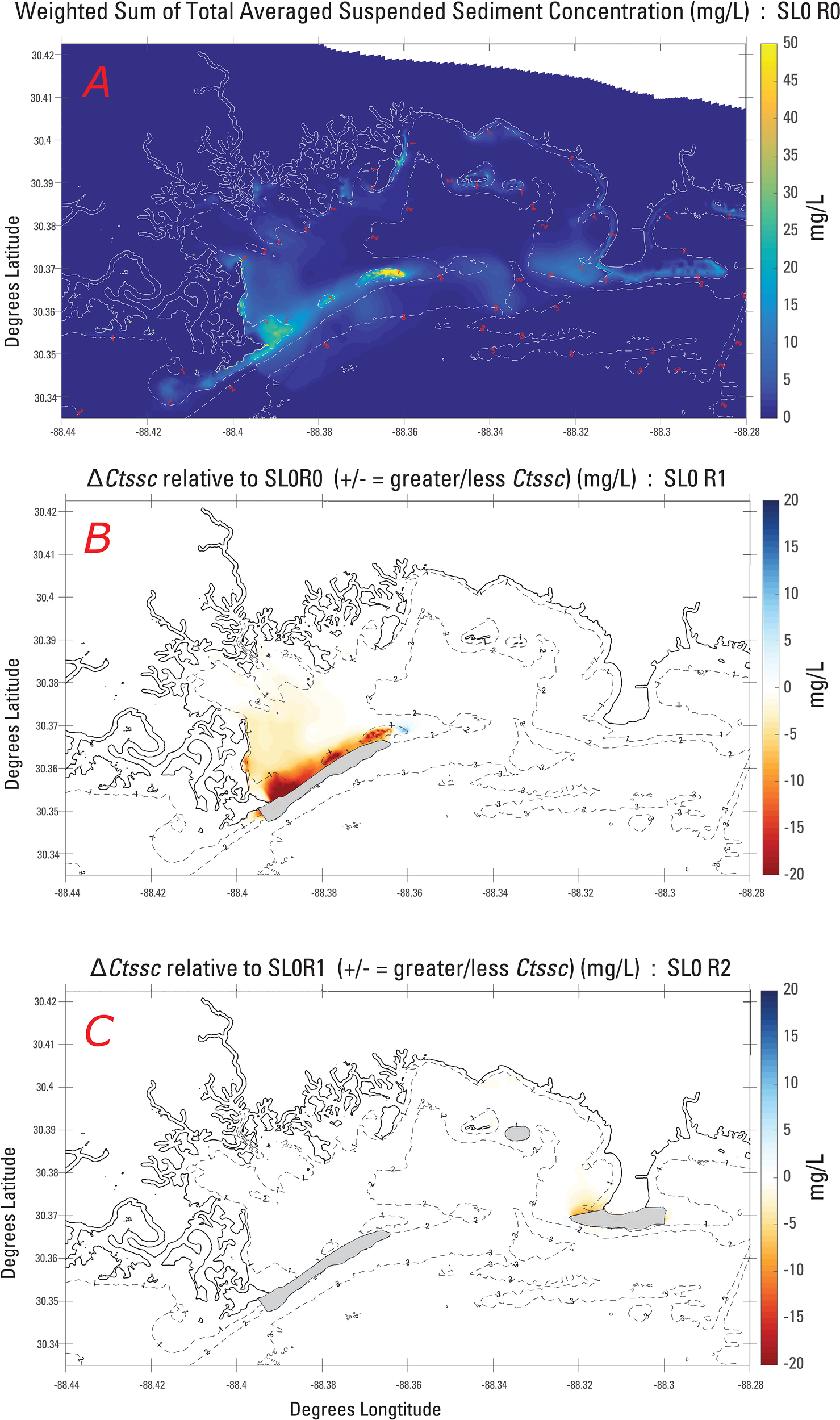 A baseline of produced by SL0R0 is given by Figure 4A. The greatest values of are found near shoals and along shorelines, with the highest concentration of sediments on the Grand Batture shoals (35 to 50 mg/L) and hot spots of 30–45 mg/L in the areas of open water along the Grand Bay marsh shoreline and South Rigolets shoreline, and shoals west of Marsh Island. in the upper and lower portions of Middle Bay ranges from 10 to 25 mg/L and from 5 to 20 mg/L, respectively. Along the Point aux Pins shoreline, nearshore is between 10 and 25 mg/L. Values along the northern marsh shoreline fall in this 10–25 mg/L range as well. On Isle Aux Dame Shoals, and in the southern reaches of Grand Bay, the estuary joins the Mississippi Sound ranges from 5 to 20 mg/L. It is important to note that this representative weighted-average calculation of does indicate regions with zero, or near-zero, sediment concentrations, which appear in the deeper regions of Grand Bay, Middle Bay, and further south in the Mississippi Sound. These very small values of are representative of the model initial concentrations (zero for all sediment fractions) and the relatively short simulation period. All concentrations represent just those sediments that are suspended by the processes of this simulation, though time averaged and weighted by frequency of occurrence, with no obfuscation by background concentrations. Model output was made publicly available as part of a U.S. Geological Survey data release (Jenkins et al., 2023).