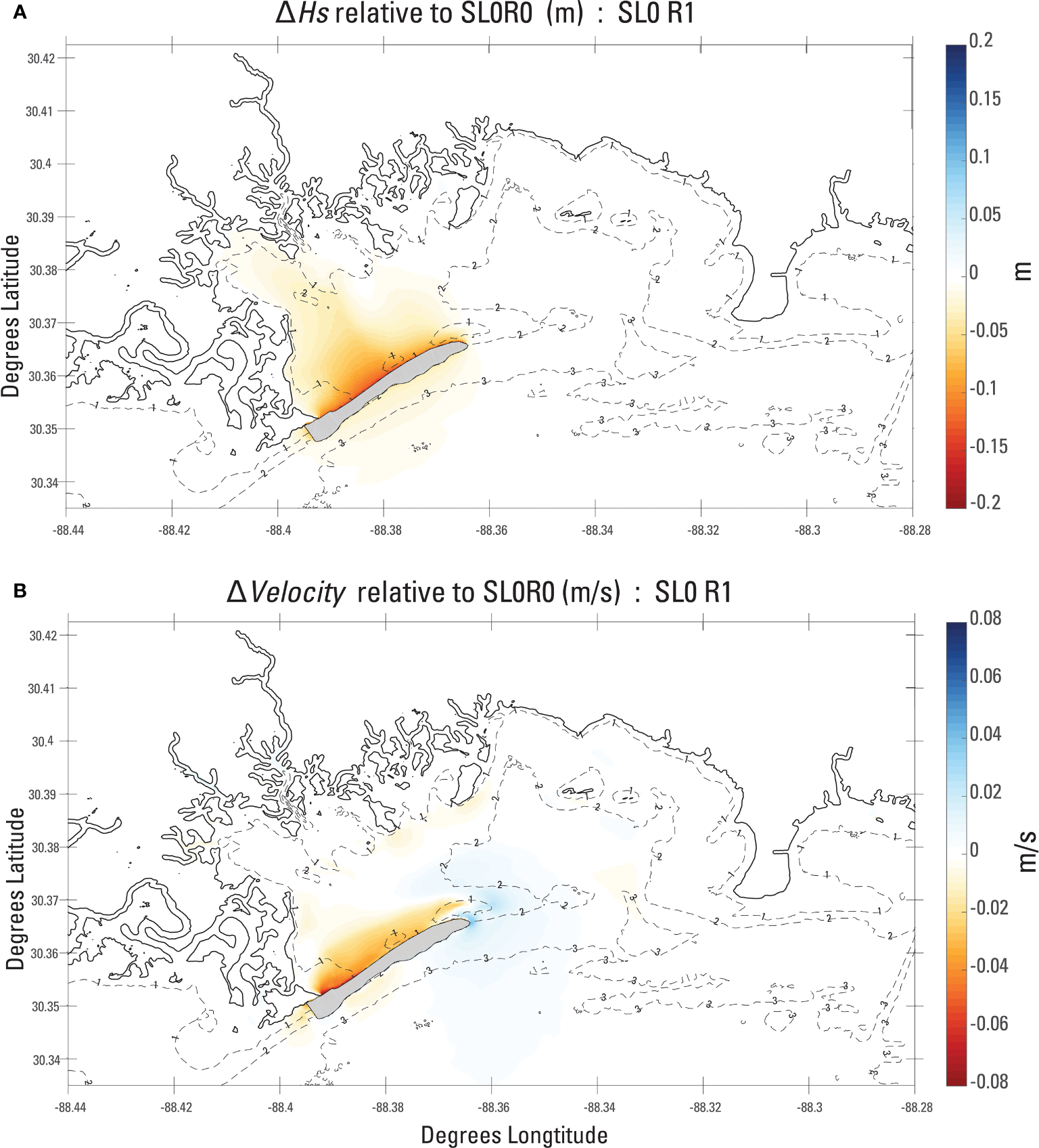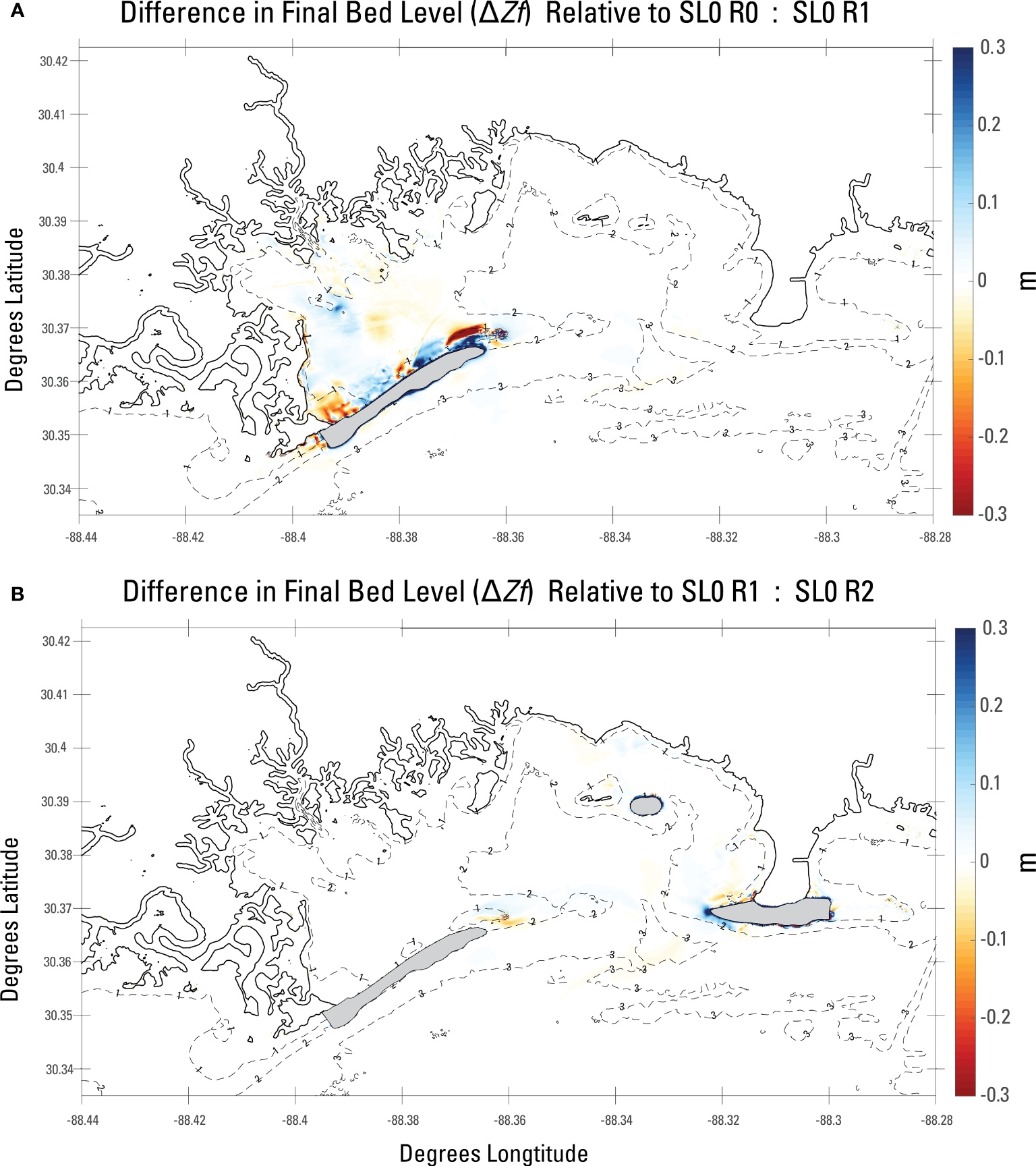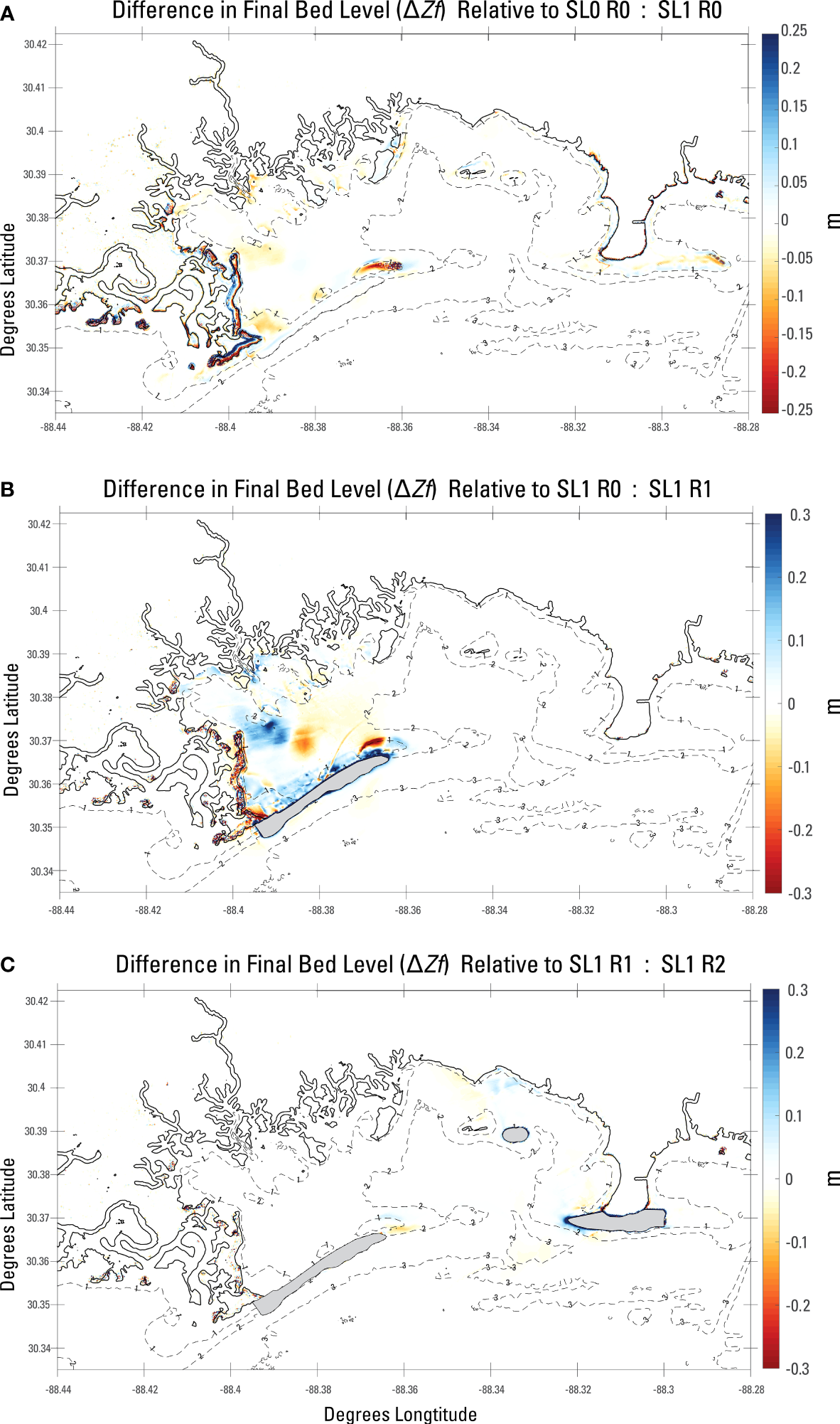 Figure 4B gives the difference in between SL0R1 and SL0R0, showing that when GBI is placed, sediment concentrations are overall reduced in the region north of GBI by 10–20 mg/L. Figure 4C, which provides difference in between SL0R1, and SL0R2, shows that when all restorations are placed, IAD and MI reduce by 5–10 mg/L, primarily in regions local to the restored features. There is no discernable influence of in the western portion of Grand Bay by the placement of MI and IAD. Both SL0R1 and SL0R2 show one region of increased relative to SL0R0 by approximately 5 mg/L just east of the eastern terminus of the GBI feature. At the approximate boundary between Grand Bay and the Mississippi Sound, surrounding the seaward side of GBI and IAD, there is an increase in following the restored features shorelines of up to 20 mg/L shown. The increase in at these shorelines is consistent with novel wave- and current-induced shear stresses at a sub-aerial shoreface, which had not previously been present.