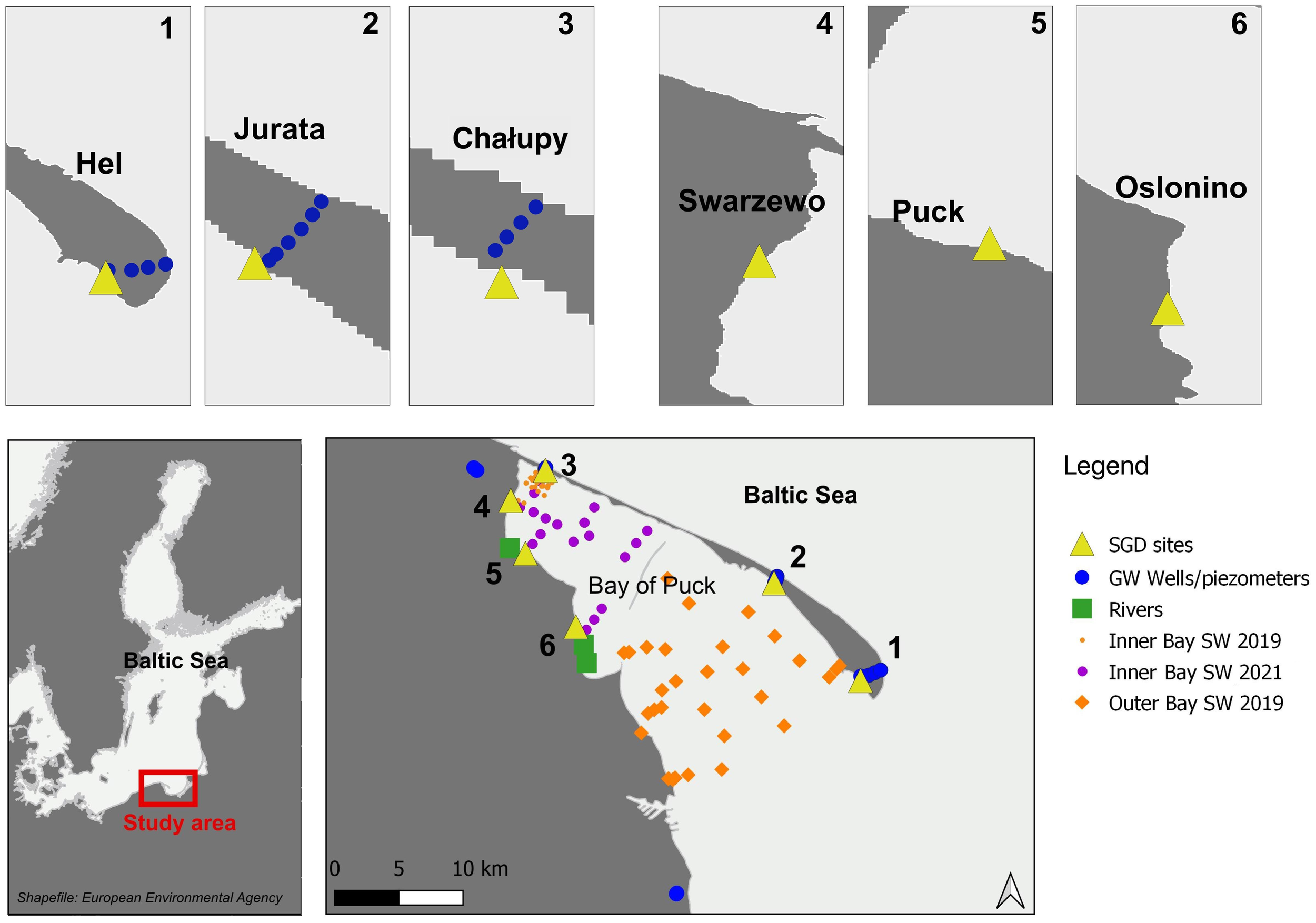 Diagram illustrating the study area. Yellow triangles correspond to sites where SGD has been identified such as Hel, Jurata, Chałupy, Swarzewo, Osłonino and Puck. The investigated area at each site was approximately 50m2. Green squares represent the sites where the rivers were sampled and blue dots represent the sites where groundwater was collected from piezometers and groundwater wells. Purple dots and orange dots correspond to the Inner Bay of Puck stations, while orange rhombus resembles to the Outer Bay of Puck stations, respectively, where surface seawater was collected.