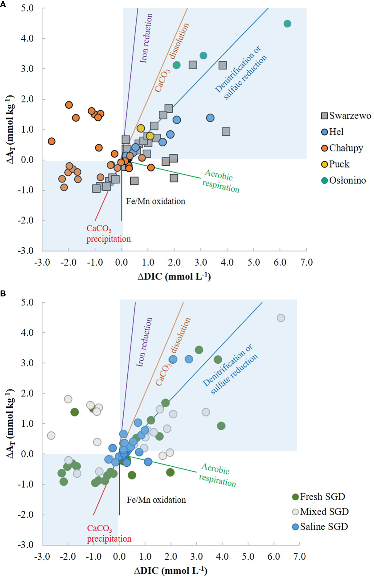 Relationship between ΔAT and ΔDIC to identify the biogeochemical pathways of carbonates in the freshwater-seawater mixing zone (A) with division into the study site, (B) with division into SGD type.