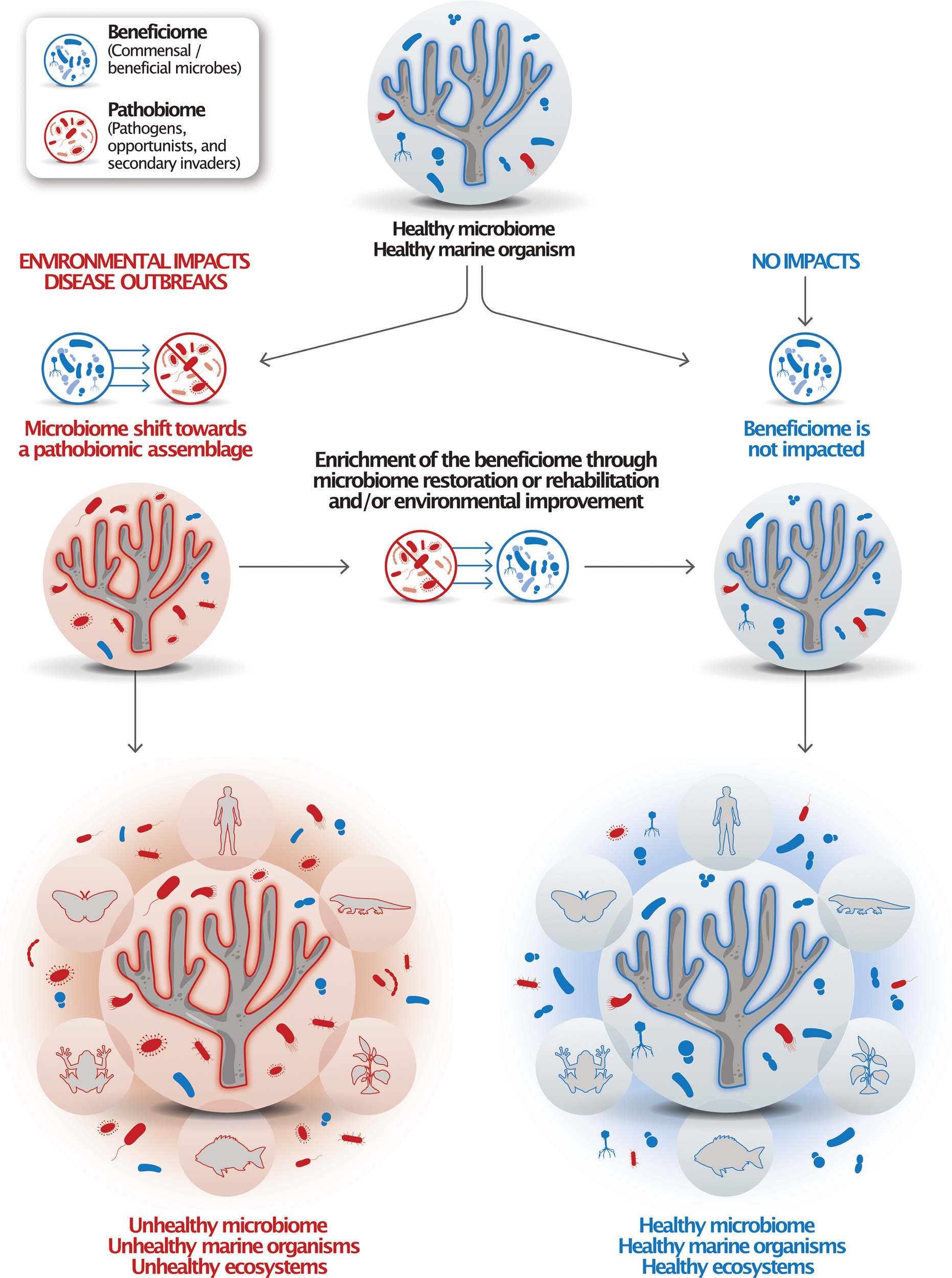 The ‘pathobiome’ and ‘beneficiome’ as types of microbial assemblages to indicate deteriorated and healthy marine organisms. Healthy marine organisms harbor and rely on healthy microbiomes. When impacted by stressors, these microbiomes tend to shift towards a pathobiotic assemblage, which can cause disease and, ultimately, death. Microbiome rehabilitation is focused on through the use of retaining or restoring a healthy microbiome, the beneficiome, which could be achieved through the application of probiotics, microbiome transplants, or other microbial therapies. Healthy organisms interact with other marine organisms and contribute to ecosystem health. Under the One Health concept, marine organismal and ecosystem health are connected to terrestrial organism and ecosystem health.