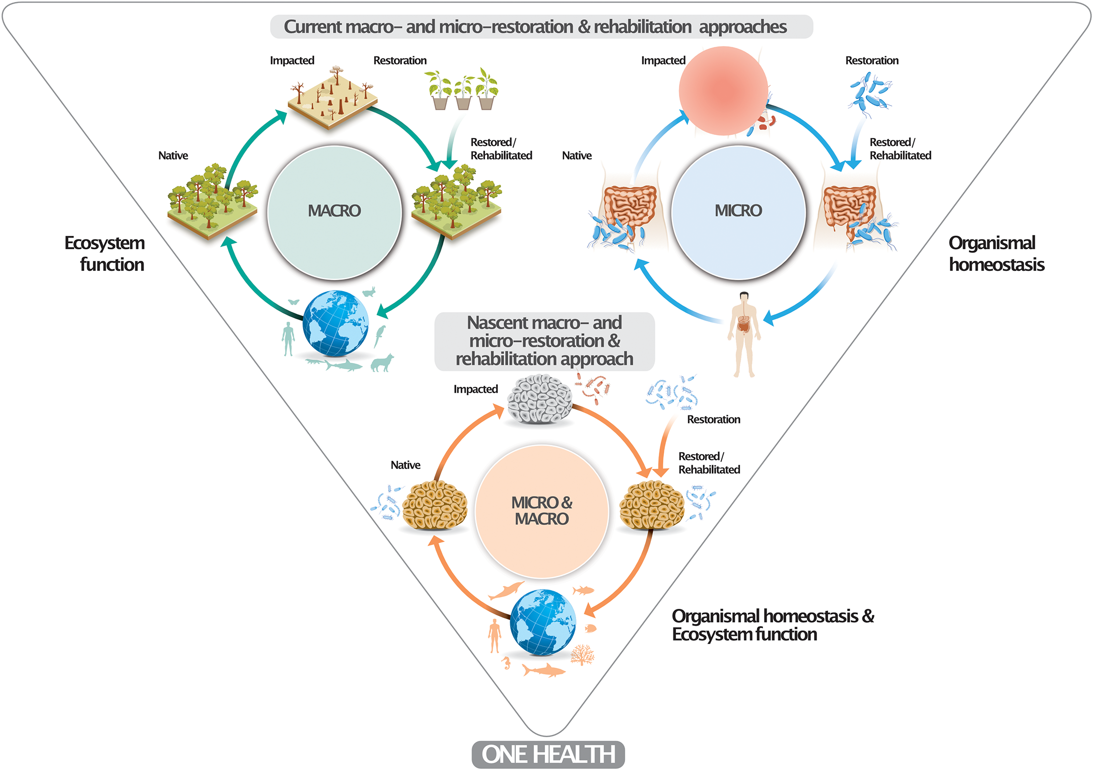 Conceptual framework of a marine micro-macro-restoration/-rehabilitation approach. The upper part depicts current macro- and micro-restoration/-rehabilitation approaches at the ecosystem- (i.e., reforestration) and organismal-level (i.e., human microbiome fecal transplants) to ascertain ecosystem function and organismal homeostasis. Marine microbiomes have been altered due to global change and local impact. The proposed marine microbiome restoration/rehabilitation approach (e.g., by means of probiotic provisioning) restores organismal homeostasis and ecosystem health (function). Similar to degraded forests and dysbiotic human gut microbiomes, impacted marine microbiomes can be restored or rehabilitated to minimize or prevent the establishment of pathobiomes, which also contributes to human well-being. The One Health concept signifies that healthy organisms in healthy ecosystems make for healthy humans.