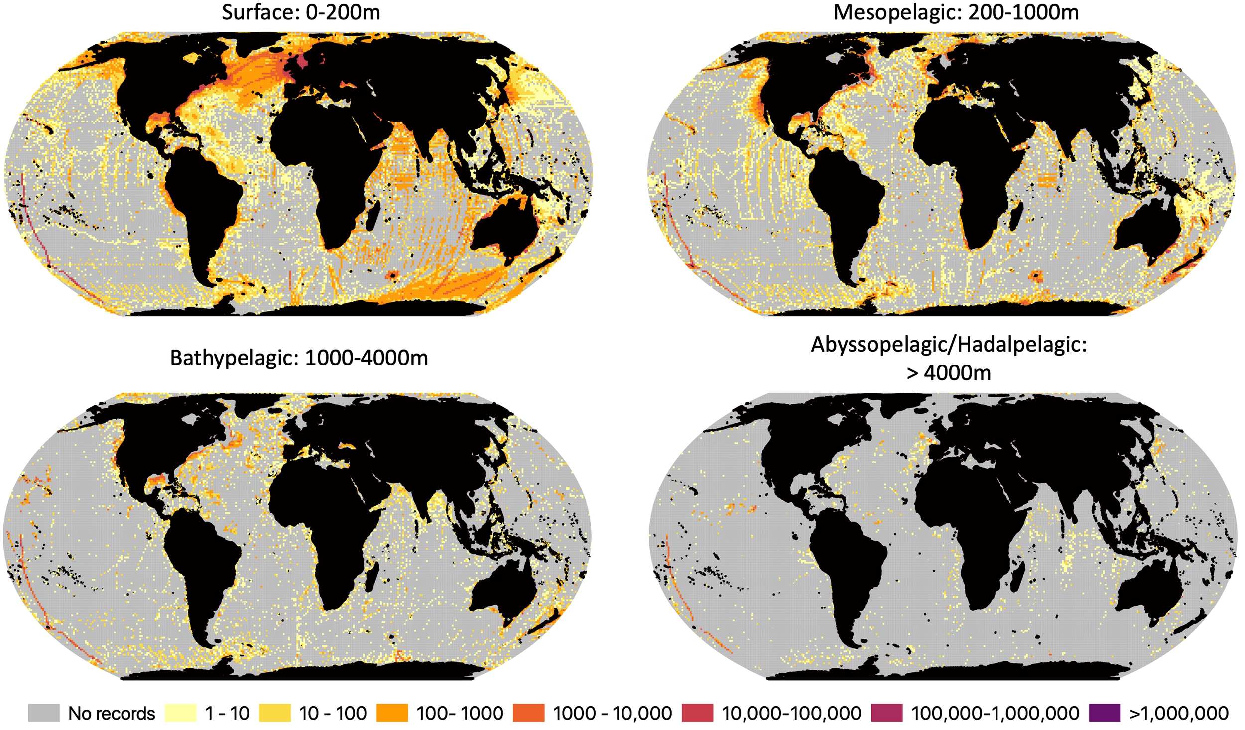 Number of OBIS records with depth information per 100 x 100 km grid for surface (0-200m), mesopelagic (200-1,000), bathypelagic (1,000-4,000m) and abyssopelagic/hadalpelagic (>4,000m) waters. Grey cells denote areas with no OBIS records.