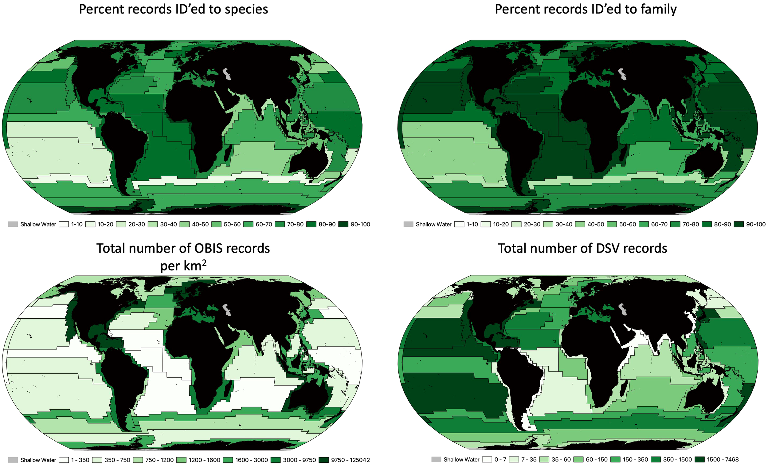 Sutton et al. (2017) proposed biogeographic provinces for mesopelagic waters (200-1,000 m). Top left is the percentage of records that were identified to the species level. Top right is the percentage of records that were identified to the family level. Bottom left represents the total number of OBIS records per km2 for each proposed province (range of records goes from 0.006 to 1.287). Bottom right is the is the total number of deep submergence dive records for each province.