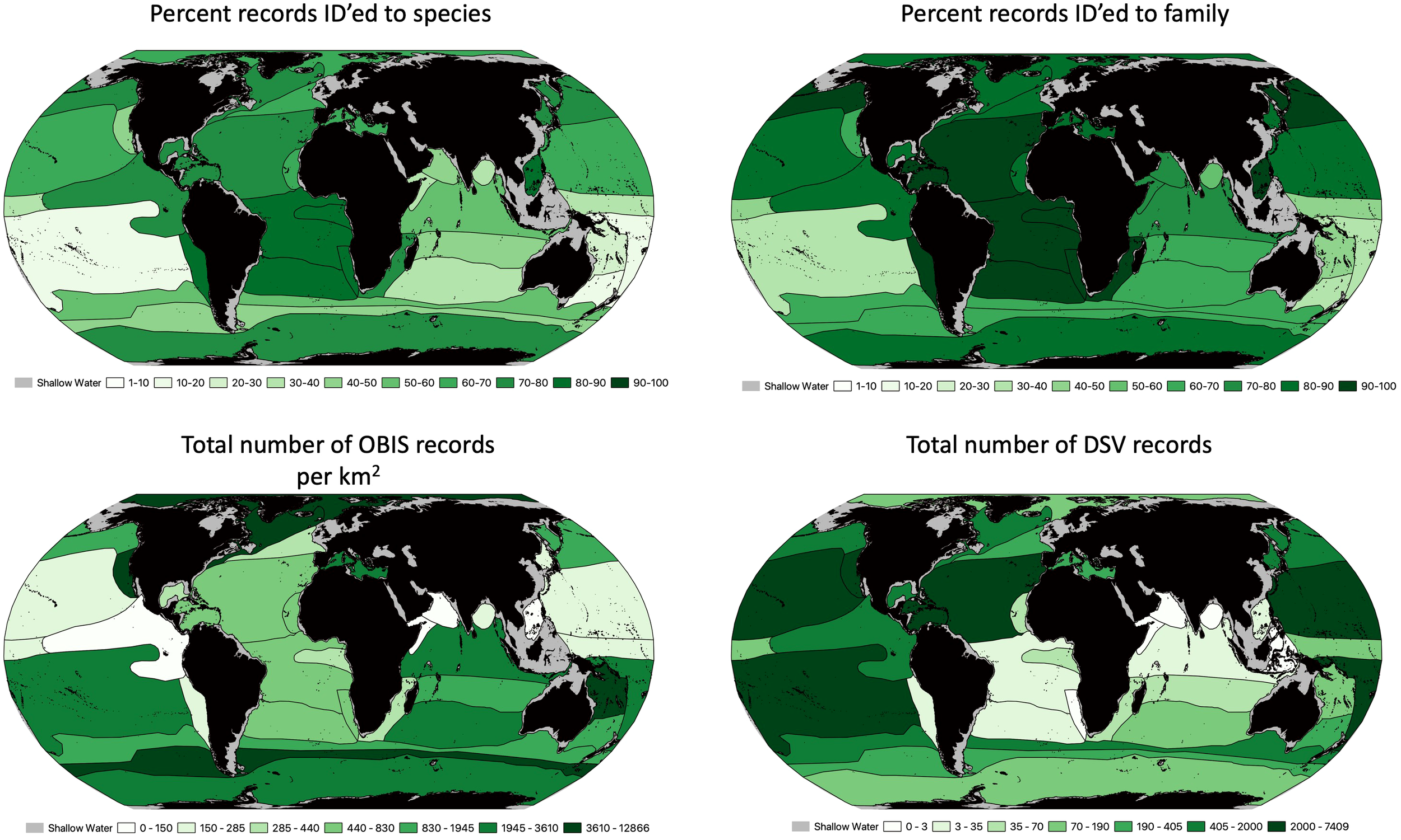 Disproportionate exploration effort, as noted above, is one of the contributors to uneven distribution of biodiversity data across the globe (Hughes et al., 2021). Even OBIS, which is a comprehensive, community driven, user-input marine biodiversity database (Klein et al., 2019) cannot adequately catalog or index every taxon on the planet because there is uneven distribution of records, many taxa are extremely difficult to identify even by experts, and there is continued interest in database improvement (Klein et al., 2019). The uneven distribution of OBIS records makes the description of marine biogeographic provinces difficult, and prohibits comprehensive biodiversity hypothesis-testing in different regions. For example, in abyssal waters, Watling et al.2013’s Brazil Basin province is described using only 14 total records (0.00000204 records km-2) in OBIS representing only six species, while in contrast, Longhursts 1996’s Coastal - Alaska Downwelling Coastal Province is represented by 2,175,924 records (3.32 records/km2). This issue is further exacerbated by the level of taxonomic identification provided within the OBIS records; while higher classification is typical, family, genus, and/or species classifications are not guaranteed. For example, in the abyssal South Pacific province, 34.7% of records contained a family level identification, but only 3.6% at the species level. Indeed, when examining across the entirety of OBIS records with depth information, only 53.8% are identified to species level (31,448,375 out of 58,442,819 records), and even at the family level, only 69.9% (40,872,702 records). Because biogeographic research most typically requires genus or species level identification (Costello and Chaudhary, 2017), OBIS records with only order or higher level identifications are of limited utility.
