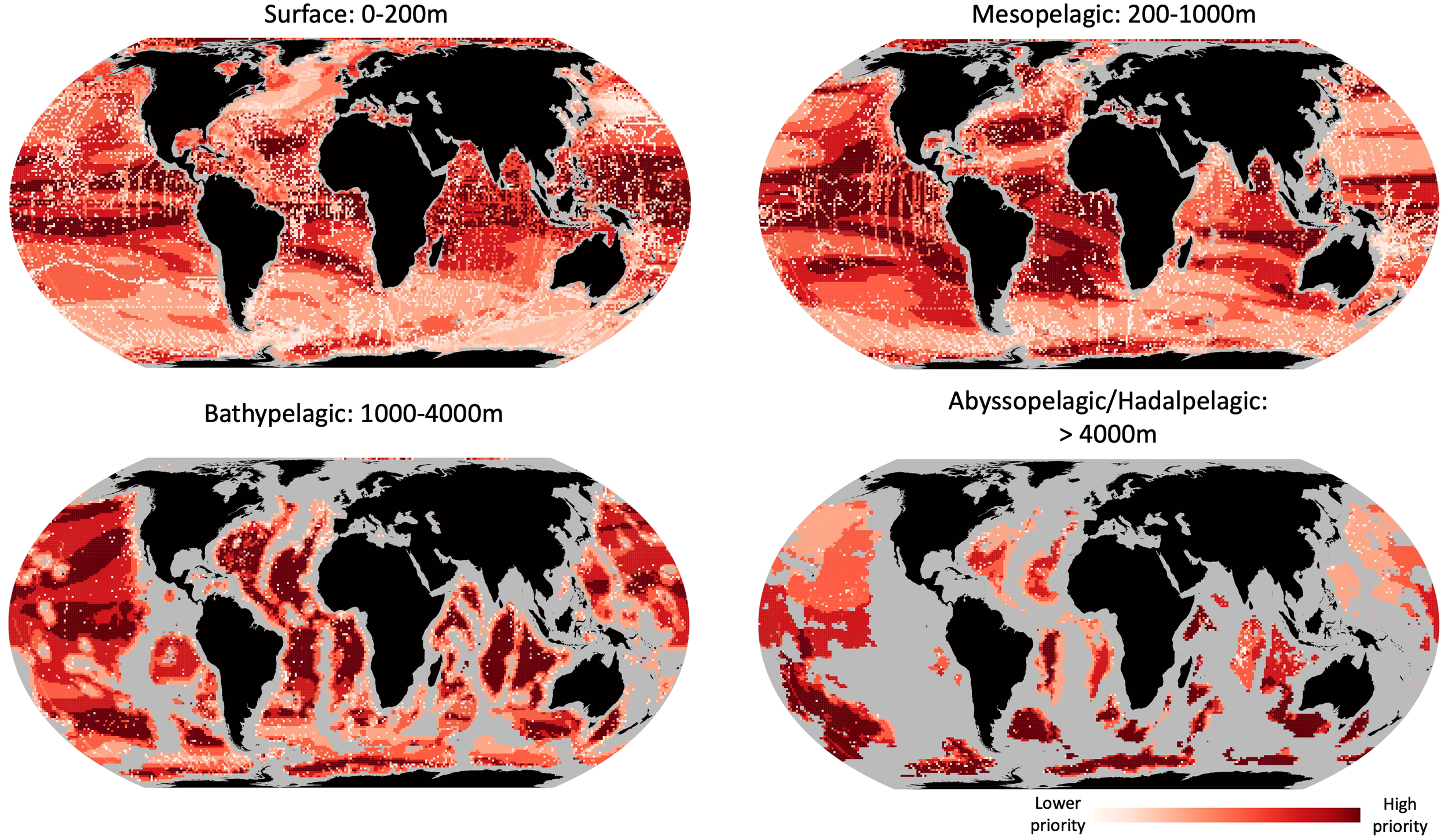 Areas of highest priority for exploration in an era of global change. Combining climate velocity estimates from Brito-Morales et al. (2020) 8.5 degree scenario with the lowest number of OBIS records for surface (0-200m), mesopelagic (200-1,000), bathypelagic (1,000-4,000m) and abyssopelagic/hadalpelagic (>4,000m) waters. Redder colors denote areas of lower number of biodiversity records and higher estimated climate change velocities.