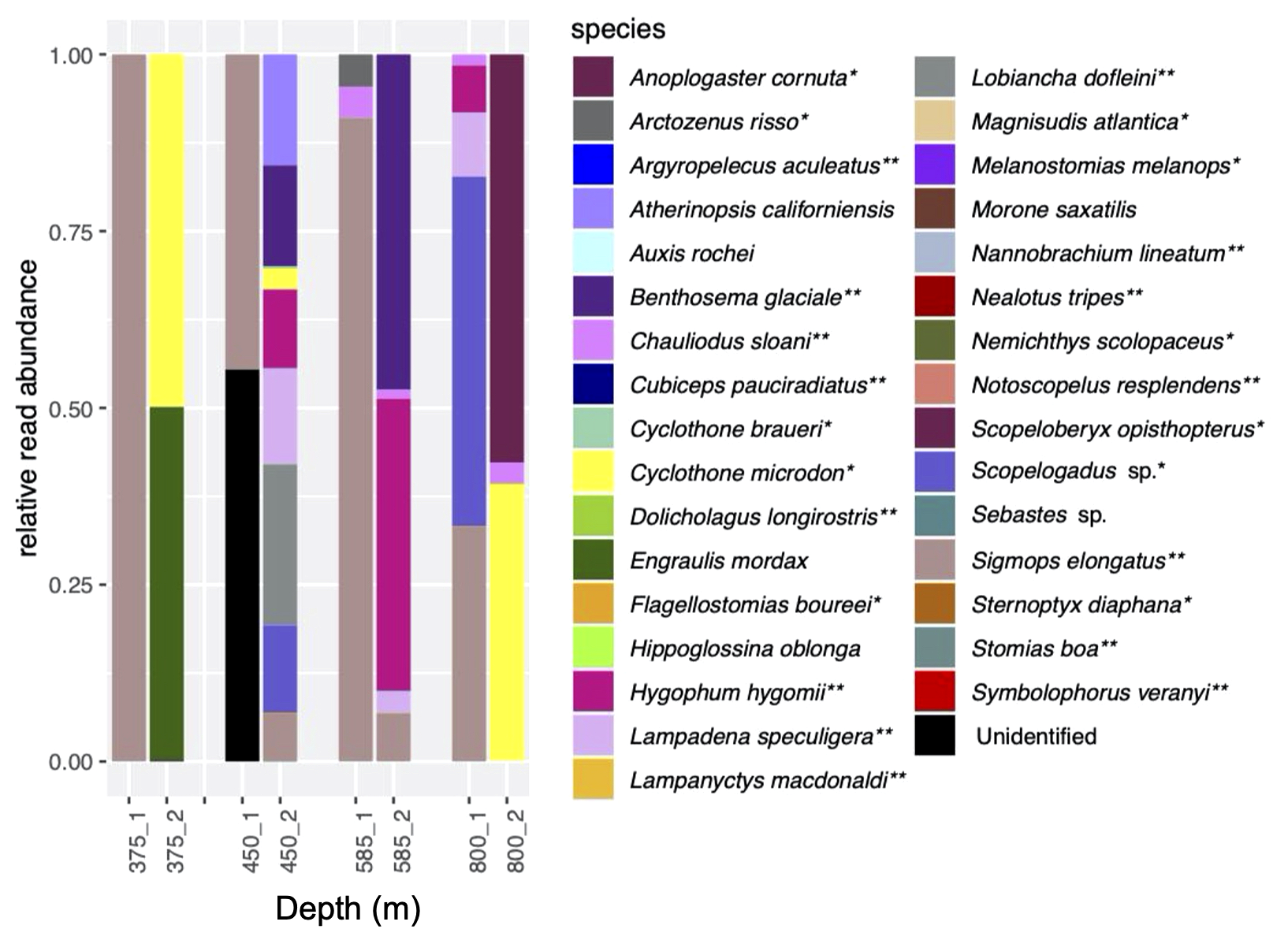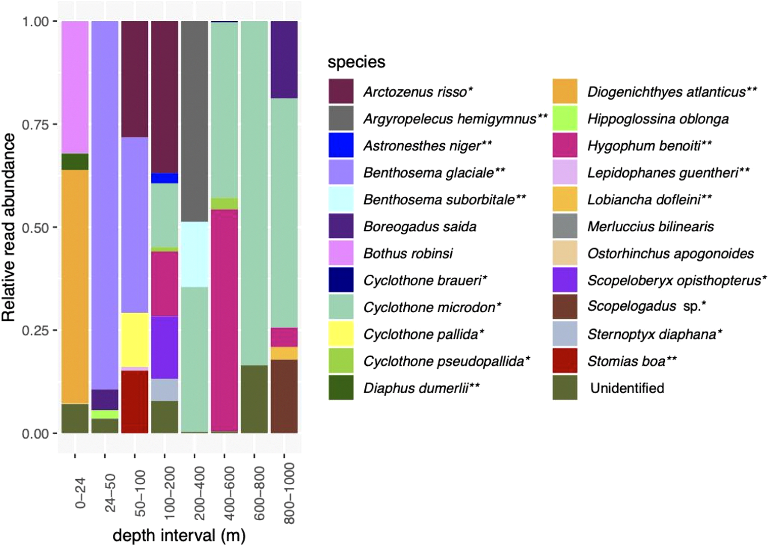 Relative read abundances of fish species detected in the MOCNESS. See Supplementary Figure 1 for depth categories that correspond with eDNA depth categories. *indicates species associated with a mesopelagic habitat; **indicates mesopelagic species thought to undertake DVM.